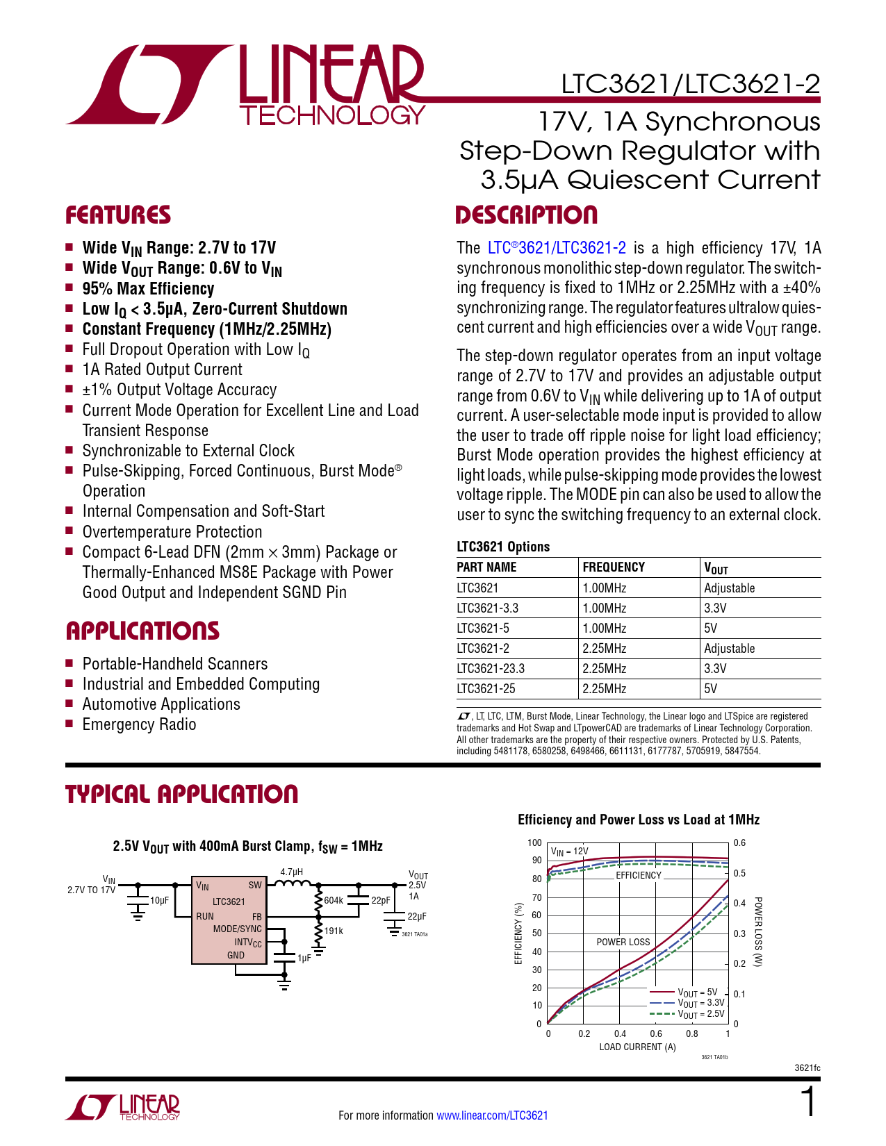 LTC3621-2 2.25MHz Adjustable n Portable-Handheld Scanners LTC3621-23.3 2.25MHz 3.3V n Industrial and Embedded Computing LTC3621-25 2.25MHz 5V n Automotive Applications n Emergency Radio L, LT, LTC, LTM, Burst Mode, Linear Technology, the Linear logo and LTSpice are registered trademarks and Hot Swap and LTpowerCAD are trademarks of Linear Technology Corporation. All other trademarks are the property of their respective owners. Protected by U.S. Patents, including 5481178, 6580258, 6498466, 6611131, 6177787, 5705919, 5847554.