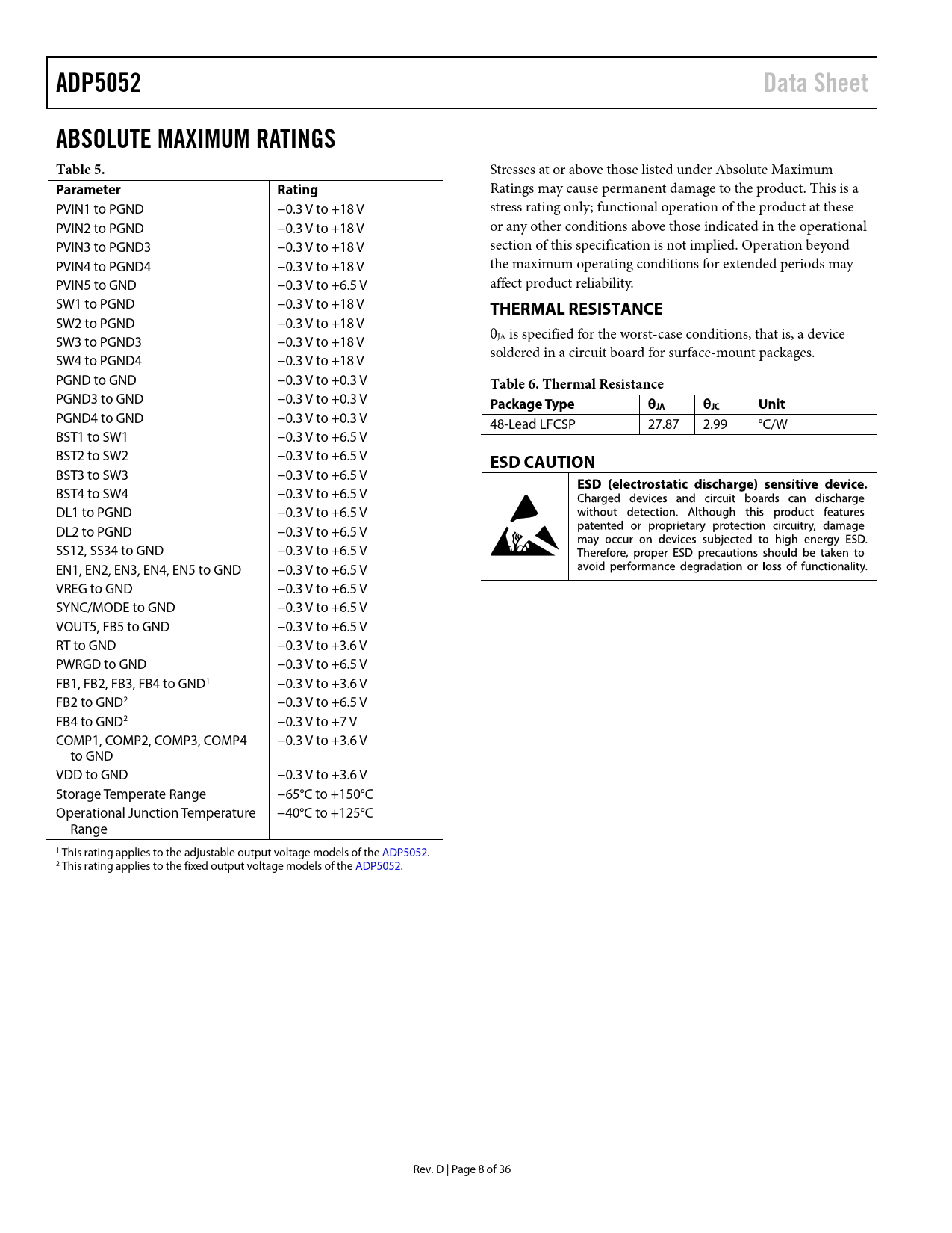 ADP5052Data SheetABSOLUTE MAXIMUM RATINGS Table 5. Stresses at or above those listed under Absolute Maximum ParameterRating Ratings may cause permanent damage to the product. This is a PVIN1 to PGND −0.3 V to +18 V stress rating only; functional operation of the product at these PVIN2 to PGND −0.3 V to +18 V or any other conditions above those indicated in the operational PVIN3 to PGND3 −0.3 V to +18 V section of this specification is not implied. Operation beyond PVIN4 to PGND4 −0.3 V to +18 V the maximum operating conditions for extended periods may PVIN5 to GND −0.3 V to +6.5 V affect product reliability. SW1 to PGND −0.3 V to +18 V THERMAL RESISTANCE SW2 to PGND −0.3 V to +18 V θ SW3 to PGND3 −0.3 V to +18 V JA is specified for the worst-case conditions, that is, a device SW4 to PGND4 −0.3 V to +18 V soldered in a circuit board for surface-mount packages. PGND to GND −0.3 V to +0.3 V Table 6. Thermal Resistance PGND3 to GND −0.3 V to +0.3 V Package TypeθJAθJCUnit PGND4 to GND −0.3 V to +0.3 V 48-Lead LFCSP 27.87 2.99 °C/W BST1 to SW1 −0.3 V to +6.5 V BST2 to SW2 −0.3 V to +6.5 V ESD CAUTION BST3 to SW3 −0.3 V to +6.5 V BST4 to SW4 −0.3 V to +6.5 V DL1 to PGND −0.3 V to +6.5 V DL2 to PGND −0.3 V to +6.5 V SS12, SS34 to GND −0.3 V to +6.5 V EN1, EN2, EN3, EN4, EN5 to GND −0.3 V to +6.5 V VREG to GND −0.3 V to +6.5 V SYNC/MODE to GND −0.3 V to +6.5 V VOUT5, FB5 to GND −0.3 V to +6.5 V RT to GND −0.3 V to +3.6 V PWRGD to GND −0.3 V to +6.5 V FB1, FB2, FB3, FB4 to GND1 −0.3 V to +3.6 V FB2 to GND2 −0.3 V to +6.5 V FB4 to GND2 −0.3 V to +7 V COMP1, COMP2, COMP3, COMP4 −0.3 V to +3.6 V to GND VDD to GND −0.3 V to +3.6 V Storage Temperate Range −65°C to +150°C Operational Junction Temperature −40°C to +125°C Range 1 This rating applies to the adjustable output voltage models of the ADP5052. 2 This rating applies to the fixed output voltage models of the ADP5052. Rev. D | Page 8 of 36 Document Outline FEATURES APPLICATIONS TYPICAL APPLICATION CIRCUIT GENERAL DESCRIPTION TABLE OF CONTENTS REVISION HISTORY DETAILED FUNCTIONAL BLOCK DIAGRAM SPECIFICATIONS BUCK REGULATOR SPECIFICATIONS LDO REGULATOR SPECIFICATIONS ABSOLUTE MAXIMUM RATINGS THERMAL RESISTANCE ESD CAUTION PIN CONFIGURATION AND FUNCTION DESCRIPTIONS TYPICAL PERFORMANCE CHARACTERISTICS THEORY OF OPERATION BUCK REGULATOR OPERATIONAL MODES PWM Mode PSM Mode Forced PWM and Automatic PWM/PSM Modes ADJUSTABLE AND FIXED OUTPUT VOLTAGES INTERNAL REGULATORS (VREG AND VDD) SEPARATE SUPPLY APPLICATIONS LOW-SIDE DEVICE SELECTION BOOTSTRAP CIRCUITRY ACTIVE OUTPUT DISCHARGE SWITCH PRECISION ENABLING OSCILLATOR Phase Shift SYNCHRONIZATION INPUT/OUTPUT SOFT START PARALLEL OPERATION STARTUP WITH PRECHARGED OUTPUT CURRENT-LIMIT PROTECTION FREQUENCY FOLDBACK Pulse Skip Mode Under Maximum Duty Cycle HICCUP PROTECTION LATCH-OFF PROTECTION Short-Circuit Latch-Off Mode Overvoltage Latch-Off Mode UNDERVOLTAGE LOCKOUT (UVLO) POWER-GOOD FUNCTION THERMAL SHUTDOWN LDO REGULATOR APPLICATIONS INFORMATION ADIsimPower DESIGN TOOL PROGRAMMING THE ADJUSTABLE OUTPUT VOLTAGE VOLTAGE CONVERSION LIMITATIONS CURRENT-LIMIT SETTING SOFT START SETTING INDUCTOR SELECTION OUTPUT CAPACITOR SELECTION INPUT CAPACITOR SELECTION LOW-SIDE POWER DEVICE SELECTION PROGRAMMING THE UVLO INPUT COMPENSATION COMPONENTS DESIGN POWER DISSIPATION Buck Regulator Power Dissipation Power Switch Conduction Loss (PCOND) Switching Loss (PSW) Transition Loss (PTRAN) Thermal Shutdown LDO Regulator Power Dissipation JUNCTION TEMPERATURE DESIGN EXAMPLE SETTING THE SWITCHING FREQUENCY SETTING THE OUTPUT VOLTAGE SETTING THE CURRENT LIMIT SELECTING THE INDUCTOR SELECTING THE OUTPUT CAPACITOR SELECTING THE LOW-SIDE MOSFET DESIGNING THE COMPENSATION NETWORK SELECTING THE SOFT START TIME SELECTING THE INPUT CAPACITOR RECOMMENDED EXTERNAL COMPONENTS CIRCUIT BOARD LAYOUT RECOMMENDATIONS TYPICAL APPLICATION CIRCUITS FACTORY DEFAULT OPTIONS OUTLINE DIMENSIONS ORDERING GUIDE