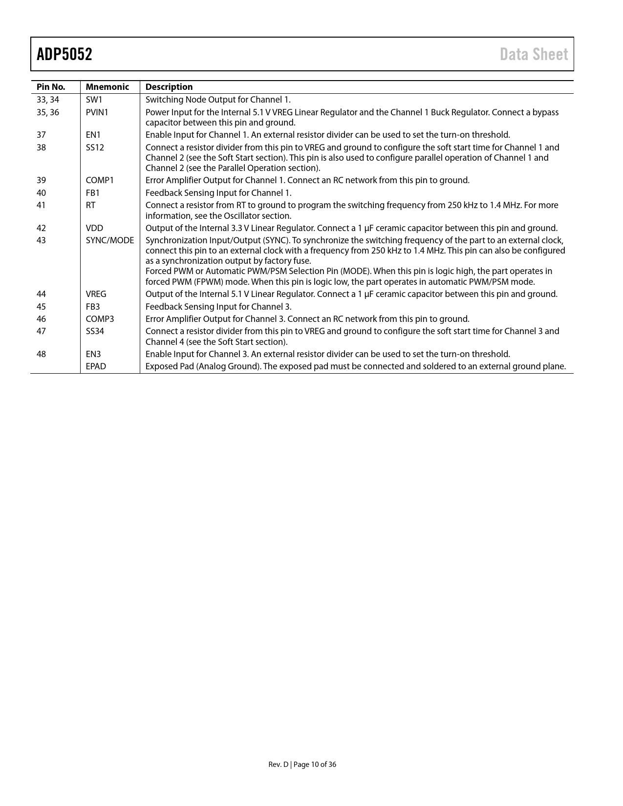 link to page 19 link to page 20 link to page 18 link to page 19 ADP5052Data SheetPin No.MnemonicDescription 33, 34 SW1 Switching Node Output for Channel 1. 35, 36 PVIN1 Power Input for the Internal 5.1 V VREG Linear Regulator and the Channel 1 Buck Regulator. Connect a bypass capacitor between this pin and ground. 37 EN1 Enable Input for Channel 1. An external resistor divider can be used to set the turn-on threshold. 38 SS12 Connect a resistor divider from this pin to VREG and ground to configure the soft start time for Channel 1 and Channel 2 (see the Soft Start section). This pin is also used to configure parallel operation of Channel 1 and Channel 2 (see the Parallel Operation section). 39 COMP1 Error Amplifier Output for Channel 1. Connect an RC network from this pin to ground. 40 FB1 Feedback Sensing Input for Channel 1. 41 RT Connect a resistor from RT to ground to program the switching frequency from 250 kHz to 1.4 MHz. For more information, see the Oscillator section. 42 VDD Output of the Internal 3.3 V Linear Regulator. Connect a 1 µF ceramic capacitor between this pin and ground. 43 SYNC/MODE Synchronization Input/Output (SYNC). To synchronize the switching frequency of the part to an external clock, connect this pin to an external clock with a frequency from 250 kHz to 1.4 MHz. This pin can also be configured as a synchronization output by factory fuse. Forced PWM or Automatic PWM/PSM Selection Pin (MODE). When this pin is logic high, the part operates in forced PWM (FPWM) mode. When this pin is logic low, the part operates in automatic PWM/PSM mode. 44 VREG Output of the Internal 5.1 V Linear Regulator. Connect a 1 µF ceramic capacitor between this pin and ground. 45 FB3 Feedback Sensing Input for Channel 3. 46 COMP3 Error Amplifier Output for Channel 3. Connect an RC network from this pin to ground. 47 SS34 Connect a resistor divider from this pin to VREG and ground to configure the soft start time for Channel 3 and Channel 4 (see the Soft Start section). 48 EN3 Enable Input for Channel 3. An external resistor divider can be used to set the turn-on threshold. EPAD Exposed Pad (Analog Ground). The exposed pad must be connected and soldered to an external ground plane. Rev. D | Page 10 of 36 Document Outline FEATURES APPLICATIONS TYPICAL APPLICATION CIRCUIT GENERAL DESCRIPTION TABLE OF CONTENTS REVISION HISTORY DETAILED FUNCTIONAL BLOCK DIAGRAM SPECIFICATIONS BUCK REGULATOR SPECIFICATIONS LDO REGULATOR SPECIFICATIONS ABSOLUTE MAXIMUM RATINGS THERMAL RESISTANCE ESD CAUTION PIN CONFIGURATION AND FUNCTION DESCRIPTIONS TYPICAL PERFORMANCE CHARACTERISTICS THEORY OF OPERATION BUCK REGULATOR OPERATIONAL MODES PWM Mode PSM Mode Forced PWM and Automatic PWM/PSM Modes ADJUSTABLE AND FIXED OUTPUT VOLTAGES INTERNAL REGULATORS (VREG AND VDD) SEPARATE SUPPLY APPLICATIONS LOW-SIDE DEVICE SELECTION BOOTSTRAP CIRCUITRY ACTIVE OUTPUT DISCHARGE SWITCH PRECISION ENABLING OSCILLATOR Phase Shift SYNCHRONIZATION INPUT/OUTPUT SOFT START PARALLEL OPERATION STARTUP WITH PRECHARGED OUTPUT CURRENT-LIMIT PROTECTION FREQUENCY FOLDBACK Pulse Skip Mode Under Maximum Duty Cycle HICCUP PROTECTION LATCH-OFF PROTECTION Short-Circuit Latch-Off Mode Overvoltage Latch-Off Mode UNDERVOLTAGE LOCKOUT (UVLO) POWER-GOOD FUNCTION THERMAL SHUTDOWN LDO REGULATOR APPLICATIONS INFORMATION ADIsimPower DESIGN TOOL PROGRAMMING THE ADJUSTABLE OUTPUT VOLTAGE VOLTAGE CONVERSION LIMITATIONS CURRENT-LIMIT SETTING SOFT START SETTING INDUCTOR SELECTION OUTPUT CAPACITOR SELECTION INPUT CAPACITOR SELECTION LOW-SIDE POWER DEVICE SELECTION PROGRAMMING THE UVLO INPUT COMPENSATION COMPONENTS DESIGN POWER DISSIPATION Buck Regulator Power Dissipation Power Switch Conduction Loss (PCOND) Switching Loss (PSW) Transition Loss (PTRAN) Thermal Shutdown LDO Regulator Power Dissipation JUNCTION TEMPERATURE DESIGN EXAMPLE SETTING THE SWITCHING FREQUENCY SETTING THE OUTPUT VOLTAGE SETTING THE CURRENT LIMIT SELECTING THE INDUCTOR SELECTING THE OUTPUT CAPACITOR SELECTING THE LOW-SIDE MOSFET DESIGNING THE COMPENSATION NETWORK SELECTING THE SOFT START TIME SELECTING THE INPUT CAPACITOR RECOMMENDED EXTERNAL COMPONENTS CIRCUIT BOARD LAYOUT RECOMMENDATIONS TYPICAL APPLICATION CIRCUITS FACTORY DEFAULT OPTIONS OUTLINE DIMENSIONS ORDERING GUIDE