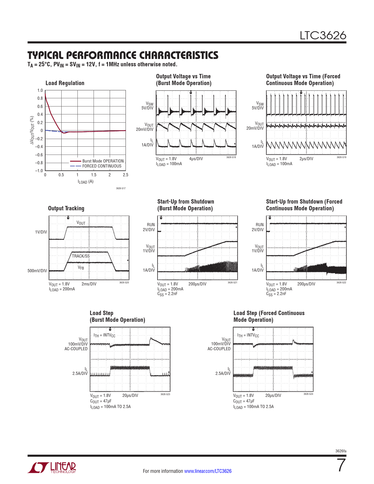 1.0 0.8 V V 0.6 SW SW 5V/DIV 5V/DIV 0.4 (%) 0.2 V V OUT OUT OUT 20mV/DIV /V 0 20mV/DIV –0.2 I ∆V OUT L IL –0.4 1A/DIV 1A/DIV –0.6 4µs/DIV 3626 G18 VOUT = 1.8V 2µs/DIV 3626 G19 VOUT = 1.8V –0.8 Burst Mode OPERATION FORCED CONTINUOUS ILOAD = 100mA ILOAD = 100mA –1.0 0 0.5 1 1.5 2 2.5 ILOAD (A) 3626 G17