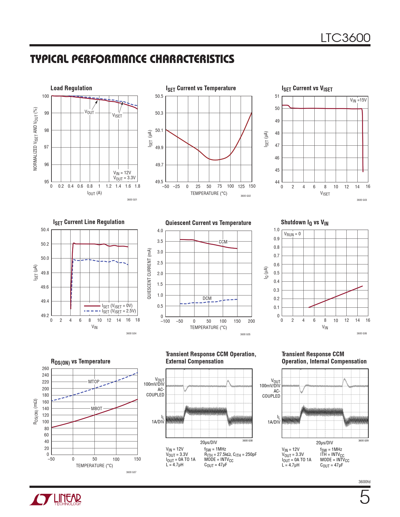 50.4 4.0 1.0 VRUN = 0 3.5 0.9 CCM 50.2 0.8 3.0 0.7 50.0 2.5 0.6 (µA) 49.8 2.0 (µA) 0.5 I Q I SET 1.5 0.4 49.6 0.3 QUIESCENT CURRENT (mA) 1.0 DCM 0.2 49.4 ISET (VISET = 0V) 0.5 0.1 ISET (VISET = 2.5V) 49.2 0 0 0 2 4 6 8 10 12 14 16 18 –100 –50 0 50 100 150 200 0 2 4 6 8 10 12 14 16 VIN TEMPERATURE (°C) VIN 3600 G04 3600 G05 3600 G06