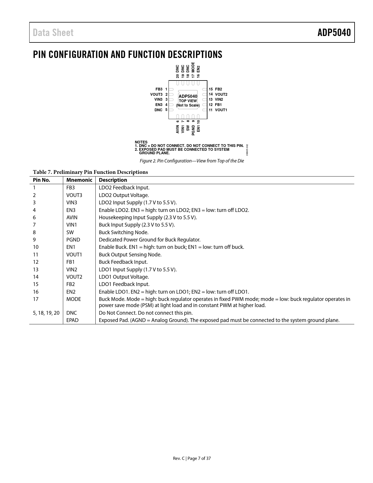 Páginas / Página37 / 7 — Data Sheet. ADP5040. PIN CONFIGURATION AND FUNCTION DESCRIPTIONS. DE O. …