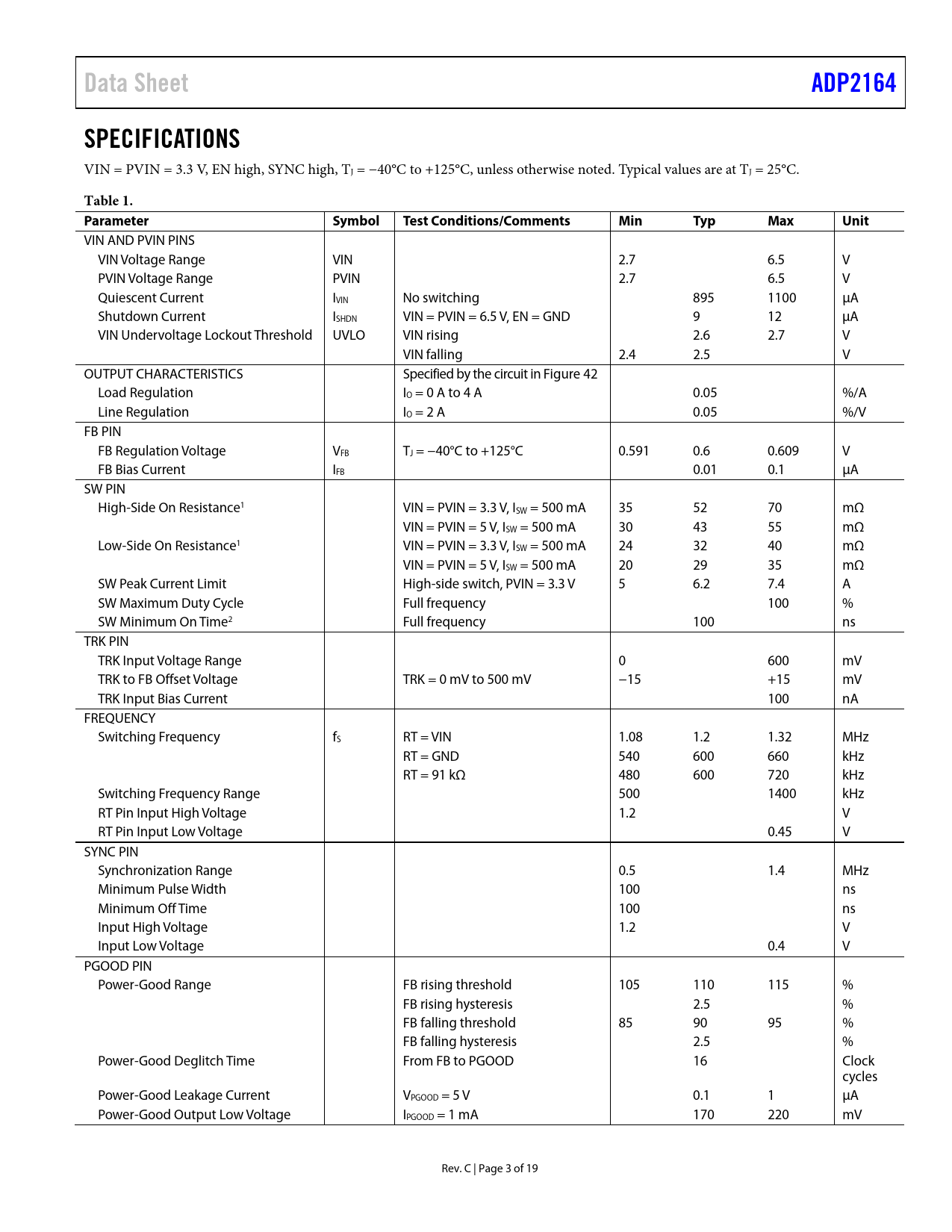 Data Sheet. ADP2164. SPECIFICATIONS. Table 1. Parameter. Symbol. Test Conditions/Comments. Min. Typ. Max. Unit