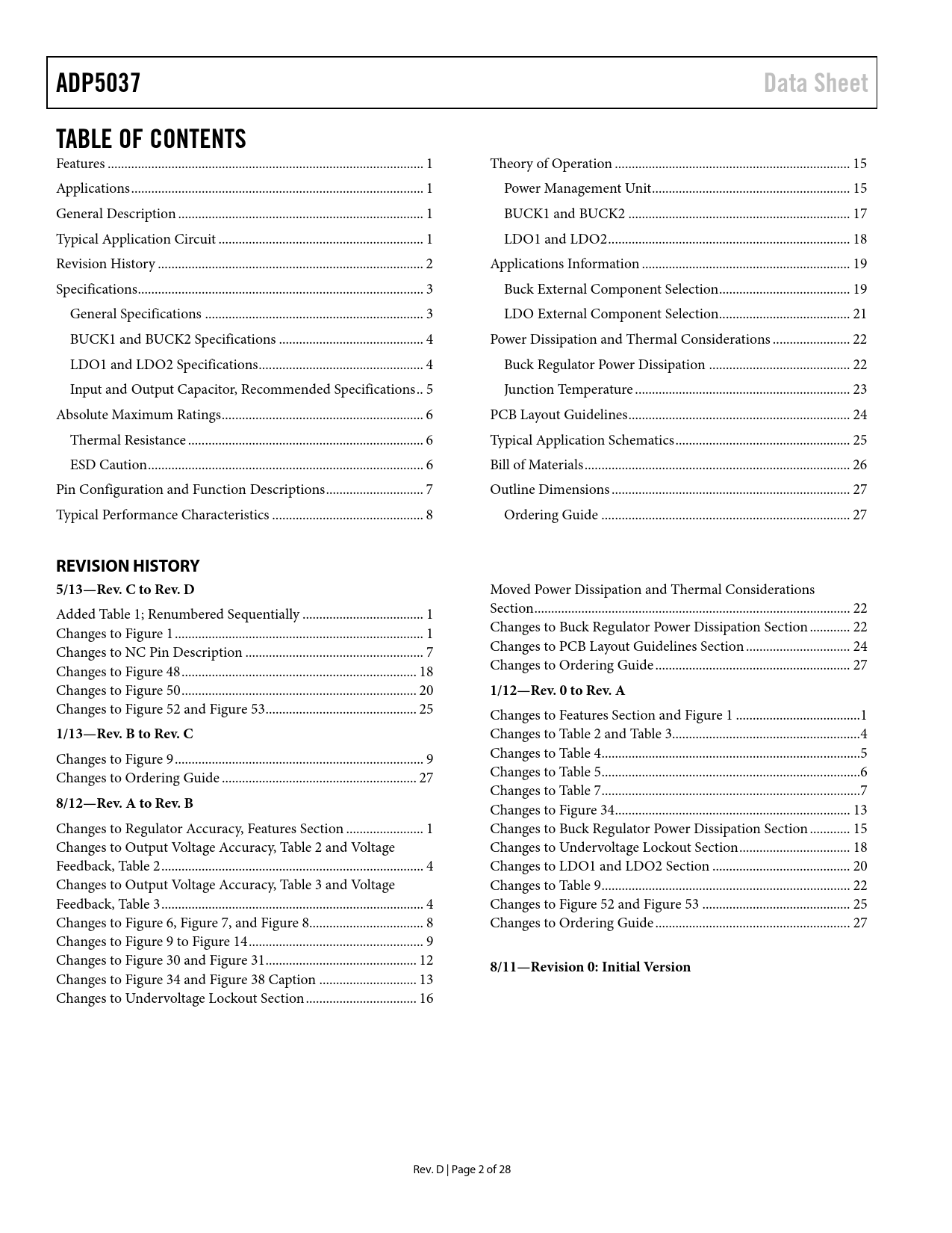 link to page 1 link to page 1 link to page 1 link to page 1 link to page 2 link to page 3 link to page 3 link to page 4 link to page 4 link to page 5 link to page 6 link to page 6 link to page 6 link to page 7 link to page 8 link to page 15 link to page 15 link to page 17 link to page 18 link to page 19 link to page 19 link to page 21 link to page 22 link to page 22 link to page 23 link to page 24 link to page 25 link to page 26 link to page 27 link to page 27 ADP5037Data SheetTABLE OF CONTENTS Features .. 1 Theory of Operation .. 15 Applications ... 1 Power Management Unit ... 15 General Description ... 1 BUCK1 and BUCK2 .. 17 Typical Application Circuit ... 1 LDO1 and LDO2 .. 18 Revision History ... 2 Applications Information .. 19 Specifications ... 3 Buck External Component Selection ... 19 General Specifications ... 3 LDO External Component Selection... 21 BUCK1 and BUCK2 Specifications ... 4 Power Dissipation and Thermal Considerations ... 22 LDO1 and LDO2 Specifications ... 4 Buck Regulator Power Dissipation .. 22 Input and Output Capacitor, Recommended Specifications .. 5 Junction Temperature .. 23 Absolute Maximum Ratings .. 6 PCB Layout Guidelines .. 24 Thermal Resistance .. 6 Typical Application Schematics .. 25 ESD Caution .. 6 Bill of Materials ... 26 Pin Configuration and Function Descriptions ... 7 Outline Dimensions ... 27 Typical Performance Characteristics ... 8 Ordering Guide .. 27 REVISION HISTORY 5/13—Rev. C to Rev. D Moved Power Dissipation and Thermal Considerations Added Table 1; Renumbered Sequential y .. 1 Section .. 22 Changes to Figure 1 .. 1 Changes to Buck Regulator Power Dissipation Section .. 22 Changes to NC Pin Description ... 7 Changes to PCB Layout Guidelines Section ... 24 Changes to Figure 48 .. 18 Changes to Ordering Guide .. 27 Changes to Figure 50 .. 20 1/12—Rev. 0 to Rev. A Changes to Figure 52 and Figure 53 ... 25 Changes to Features Section and Figure 1 ... 1 1/13—Rev. B to Rev. C Changes to Table 2 and Table 3.. 4 Changes to Figure 9 .. 9 Changes to Table 4 ... 5 Changes to Ordering Guide .. 27 Changes to Table 5 ... 6 Changes to Table 7 ... 7 8/12—Rev. A to Rev. B Changes to Figure 34 .. 13 Changes to Regulator Accuracy, Features Section ... 1 Changes to Buck Regulator Power Dissipation Section .. 15 Changes to Output Voltage Accuracy, Table 2 and Voltage Changes to Undervoltage Lockout Section ... 18 Feedback, Table 2 .. 4 Changes to LDO1 and LDO2 Section ... 20 Changes to Output Voltage Accuracy, Table 3 and Voltage Changes to Table 9 .. 22 Feedback, Table 3 .. 4 Changes to Figure 52 and Figure 53 .. 25 Changes to Figure 6, Figure 7, and Figure 8.. 8 Changes to Ordering Guide .. 27 Changes to Figure 9 to Figure 14 .. 9 Changes to Figure 30 and Figure 31 ... 12 8/11—Revision 0: Initial Version Changes to Figure 34 and Figure 38 Caption ... 13 Changes to Undervoltage Lockout Section ... 16 Rev. D | Page 2 of 28 Document Outline Features Applications General Description Typical Application Circuit Revision History Specifications General Specifications BUCK1 and BUCK2 Specifications LDO1 and LDO2 Specifications Input and Output Capacitor, Recommended Specifications Absolute Maximum Ratings Thermal Resistance ESD Caution Pin Configuration and Function Descriptions Typical Performance Characteristics Theory of Operation Power Management Unit Thermal Protection Undervoltage Lockout Enable/Shutdown BUCK1 and BUCK2 Control Scheme PWM Mode Power Save Mode (PSM) PSM Current Threshold Oscillator/Phasing of Inductor Switching Short-Circuit Protection Soft Start Current Limit 100% Duty Operation Active Pull-Downs LDO1 and LDO2 Applications Information Buck External Component Selection Feedback Resistors Inductor Output Capacitor Input Capacitor LDO External Component Selection Feedback Resistors Output Capacitor Input Bypass Capacitor Input and Output Capacitor Properties Power Dissipation and Thermal Considerations Buck Regulator Power Dissipation LDO Regulator Power Dissipation Junction Temperature PCB Layout Guidelines Typical Application Schematics Bill of Materials Outline Dimensions Ordering Guide