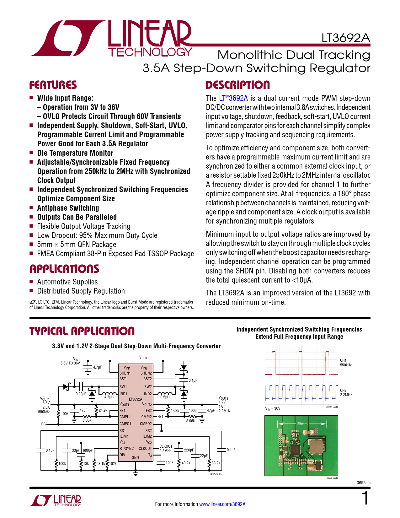 LT3692A Monolithic Dual Tracking 3.5A Step-Down Switching Regulator FeaTuresDescripTion n Wide Input Range: The LT®3692A is a dual current mode PWM step-down – Operation from 3V to 36V DC/DC converter with two internal 3.8A switches. Independent – OVLO Protects Circuit Through 60V Transients input voltage, shutdown, feedback, soft-start, UVLO current n Independent Supply, Shutdown, Soft-Start, UVLO, limit and comparator pins for each channel simplify complex Programmable Current Limit and Programmable power supply tracking and sequencing requirements. Power Good for Each 3.5A Regulator To optimize efficiency and component size, both convert- n Die Temperature Monitor ers have a programmable maximum current limit and are n Adjustable/Synchronizable Fixed Frequency synchronized to either a common external clock input, or Operation from 250kHz to 2MHz with Synchronized a resistor settable fixed 250kHz to 2MHz internal oscillator. Clock Output A frequency divider is provided for channel 1 to further n Independent Synchronized Switching Frequencies optimize component size. At all frequencies, a 180° phase Optimize Component Size relationship between channels is maintained, reducing volt- n Antiphase Switching age ripple and component size. A clock output is available n Outputs Can Be Paralleled for synchronizing multiple regulators. n Flexible Output Voltage Tracking n Low Dropout: 95% Maximum Duty Cycle Minimum input to output voltage ratios are improved by n 5mm × 5mm QFN Package allowing the switch to stay on through multiple clock cycles n FMEA Compliant 38-Pin Exposed Pad TSSOP Package only switching off when the boost capacitor needs recharg- ing. Independent channel operation can be programmed applicaTions using the SHDN pin. Disabling both converters reduces n Automotive Supplies the total quiescent current to <10µA. n Distributed Supply Regulation The LT3692A is an improved version of the LT3692 with L, LT, LTC, LTM, Linear Technology, the Linear logo and Burst Mode are registered trademarks reduced minimum on-time. of Linear Technology Corporation. All other trademarks are the property of their respective owners. Typical applicaTionIndependent Synchronized Switching FrequenciesExtend Full Frequency Input Range3.3V and 1.2V 2-Stage Dual Step-Down Multi-Frequency Converter V V IN1 OUT1 CH1: 5.5V TO 36V 4.7µF V 550kHz IN1 VIN2 SHDN1 SHDN2 BST1 BST2 0.1µF SW1 SW2 CH2: 0.22µF IND1 IND2 2.2MHz V 4.7µH 0.5µH OUT1 LT3692A VOUT2 3.3V V 1.2V OUT1 VOUT2 2.5A 1A 47µF 24.9k FB1 FB2 V 550kHz 4.02k 100p 47µF 2.2MHz IN = 30V 3692A TA01b 100k CMPI1 CMPI2 FB1 8.06k 8.06k PG CMPO1 CMPO2 SS1 SS2 ILIM1 ILIM2 VC1 VC2 RT/SYNC CLKOUT CLKOUT 0.1µF 33pF 680pF 2.2MHz 220pF 0.1µF DIV TJ GND 22pF 100k 13k 68.1k 102k 10nF 40.2k 33.2k 3692a TA01a 3692a TA01c 3692afc For more information www.linear.com/3692A 1 Document Outline Features Description Applications Typical Application Absolute Maximum Ratings Pin Configuration Order Information Electrical Characteristics Typical Performance Characteristics Pin Functions Block Diagram Applications Information Typical Applications Package Description Revision History Typical Application Related Parts