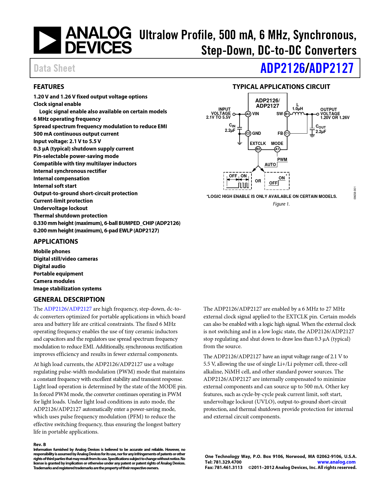 Ultralow Profile, 500 mA, 6 MHz, Synchronous,. Step-Down, DC-to-DC Converters. Data Sheet. ADP2126. /ADP2127. FEATURES