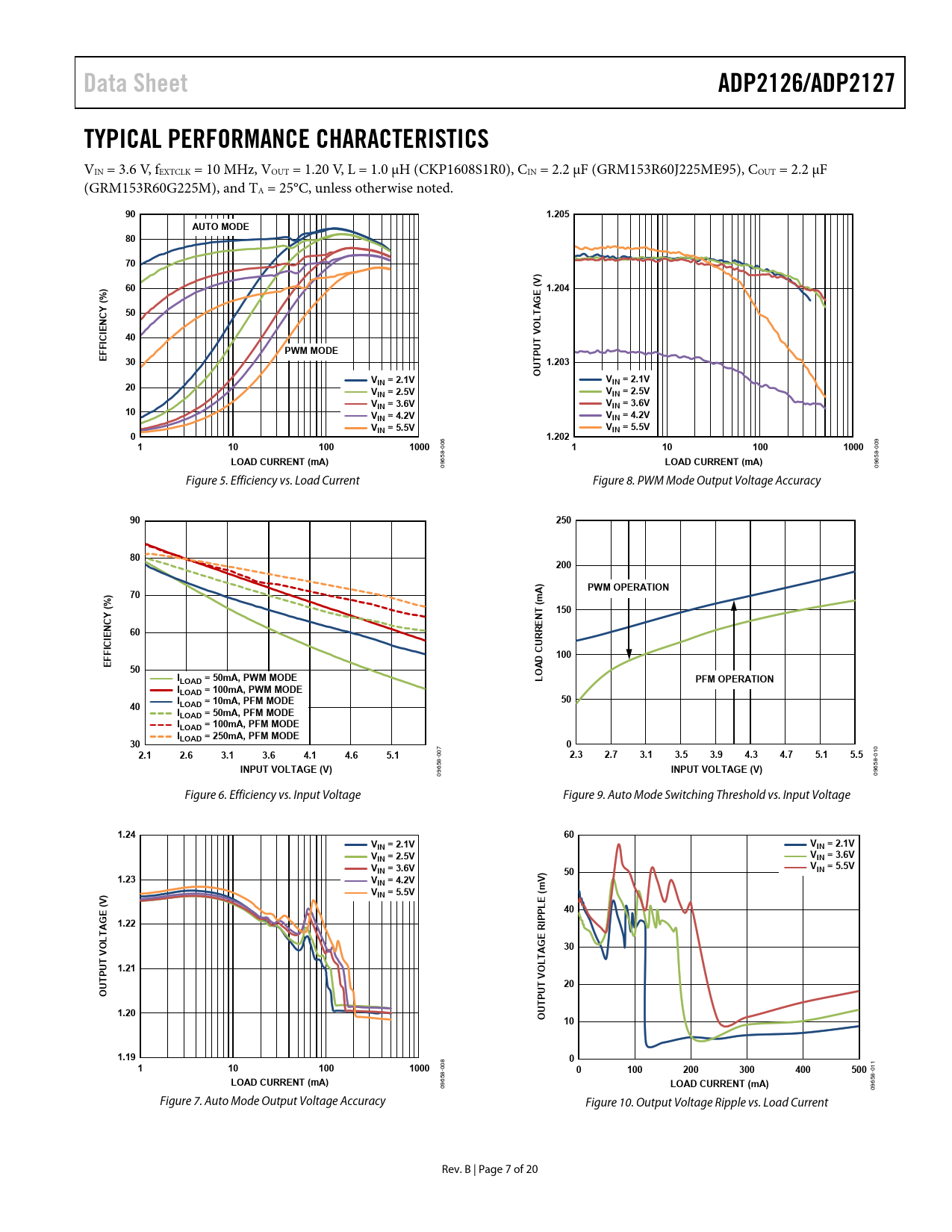 Data Sheet. ADP2126/ADP2127. TYPICAL PERFORMANCE CHARACTERISTICS. 1.205. AUTO MODE. (V 1.204. C N. LT O. IE C. V T U. FFI. PWM MODE. TP 1.203
