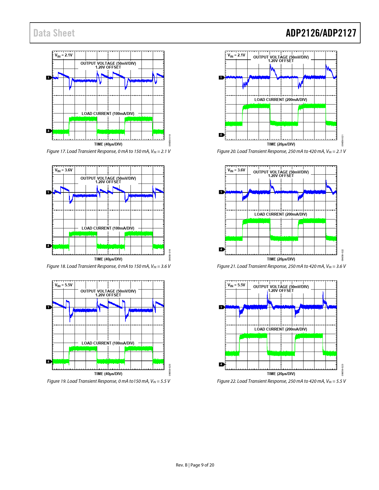 Data Sheet. ADP2126/ADP2127. VIN = 2.1V. OUTPUT VOLTAGE (50mV/DIV). 1.20V OFFSET. LOAD CURRENT (200mA/DIV)