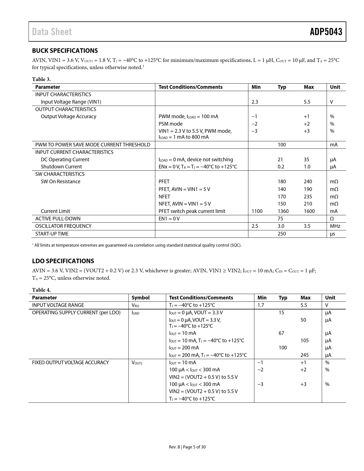 Data Sheet. ADP5043. BUCK SPECIFICATIONS. Table 3. Parameter. Test Conditions/Comments. Min. Typ. Max. Unit. LDO SPECIFICATIONS