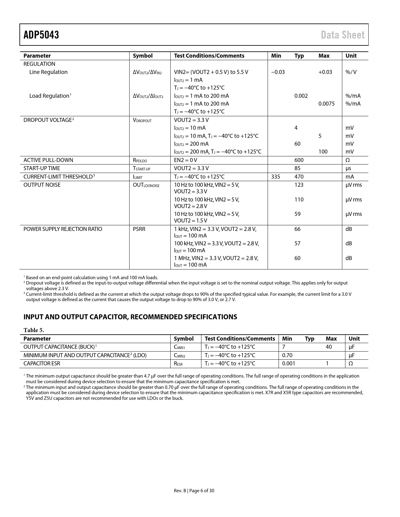 Páginas / Página30 / 6 — ADP5043. Data Sheet. Parameter. Symbol. Test Conditions/Comments. Min. …