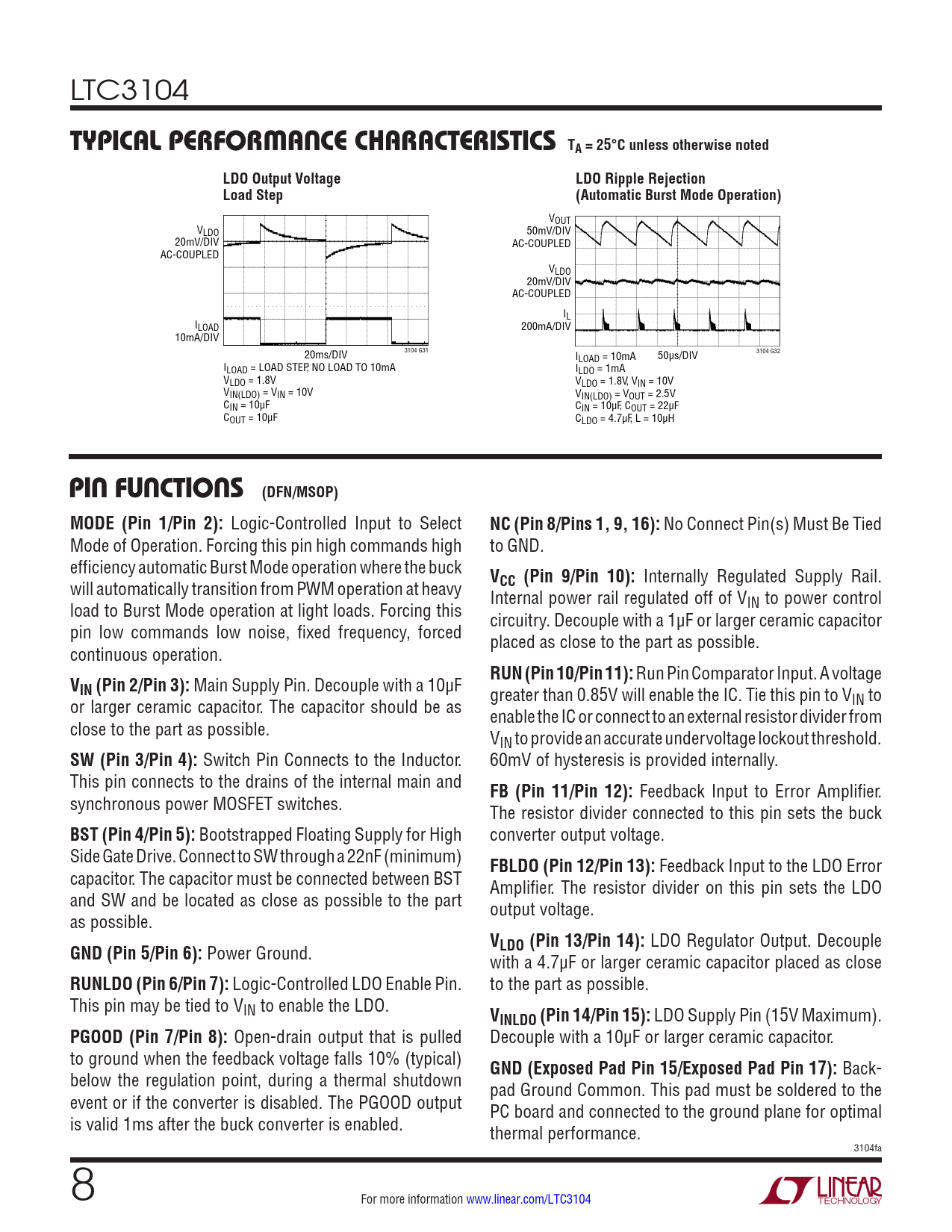 LTC3104 TYPICAL PERFORMANCE CHARACTERISTICS TA = 25°C unless otherwise notedLDO Output VoltageLDO Ripple RejectionLoad Step(Automatic Burst Mode Operation) VOUT VLDO 50mV/DIV 20mV/DIV AC-COUPLED AC-COUPLED VLDO 20mV/DIV AC-COUPLED IL ILOAD 200mA/DIV 10mA/DIV 20ms/DIV 3104 G31 50µs/DIV 3104 G32 ILOAD = 10mA ILOAD = LOAD STEP, NO LOAD TO 10mA ILDO = 1mA VLDO = 1.8V VLDO = 1.8V, VIN = 10V VIN(LDO) = VIN = 10V VIN(LDO) = VOUT = 2.5V CIN = 10µF CIN = 10µF, COUT = 22µF COUT = 10µF CLDO = 4.7µF, L = 10µH PIN FUNCTIONS (DFN/MSOP)MODE (Pin 1/Pin 2): Logic-Controlled Input to Select NC (Pin 8/Pins 1, 9, 16): No Connect Pin(s) Must Be Tied Mode of Operation. Forcing this pin high commands high to GND. efficiency automatic Burst Mode operation where the buck V will automatically transition from PWM operation at heavy CC (Pin 9/Pin 10): Internally Regulated Supply Rail. Internal power rail regulated off of V load to Burst Mode operation at light loads. Forcing this IN to power control circuitry. Decouple with a 1µF or larger ceramic capacitor pin low commands low noise, fixed frequency, forced placed as close to the part as possible. continuous operation. RUN (Pin 10/Pin 11): Run Pin Comparator Input. A voltage VIN (Pin 2/Pin 3): Main Supply Pin. Decouple with a 10µF greater than 0.85V will enable the IC. Tie this pin to V or larger ceramic capacitor. The capacitor should be as IN to enable the IC or connect to an external resistor divider from close to the part as possible. VIN to provide an accurate undervoltage lockout threshold. SW (Pin 3/Pin 4): Switch Pin Connects to the Inductor. 60mV of hysteresis is provided internally. This pin connects to the drains of the internal main and FB (Pin 11/Pin 12): Feedback Input to Error Amplifier. synchronous power MOSFET switches. The resistor divider connected to this pin sets the buck BST (Pin 4/Pin 5): Bootstrapped Floating Supply for High converter output voltage. Side Gate Drive. Connect to SW through a 22nF (minimum) FBLDO (Pin 12/Pin 13): Feedback Input to the LDO Error capacitor. The capacitor must be connected between BST Amplifier. The resistor divider on this pin sets the LDO and SW and be located as close as possible to the part output voltage. as possible. VGND (Pin 5/Pin 6): Power Ground. LDO (Pin 13/Pin 14): LDO Regulator Output. Decouple with a 4.7µF or larger ceramic capacitor placed as close RUNLDO (Pin 6/Pin 7): Logic-Controlled LDO Enable Pin. to the part as possible. This pin may be tied to VIN to enable the LDO. VINLDO (Pin 14/Pin 15): LDO Supply Pin (15V Maximum). PGOOD (Pin 7/Pin 8): Open-drain output that is pulled Decouple with a 10µF or larger ceramic capacitor. to ground when the feedback voltage falls 10% (typical) GND (Exposed Pad Pin 15/Exposed Pad Pin 17): Back- below the regulation point, during a thermal shutdown pad Ground Common. This pad must be soldered to the event or if the converter is disabled. The PGOOD output PC board and connected to the ground plane for optimal is valid 1ms after the buck converter is enabled. thermal performance. 3104fa 8 For more information www.linear.com/LTC3104 Document Outline Features Applications Description Typical Application Absolute Maximum Ratings Order Information Electrical Characteristics Typical Performance Characteristics Pin Functions Block Diagram Operation Applications Information Typical Applications Package Description Typical Application Related Parts