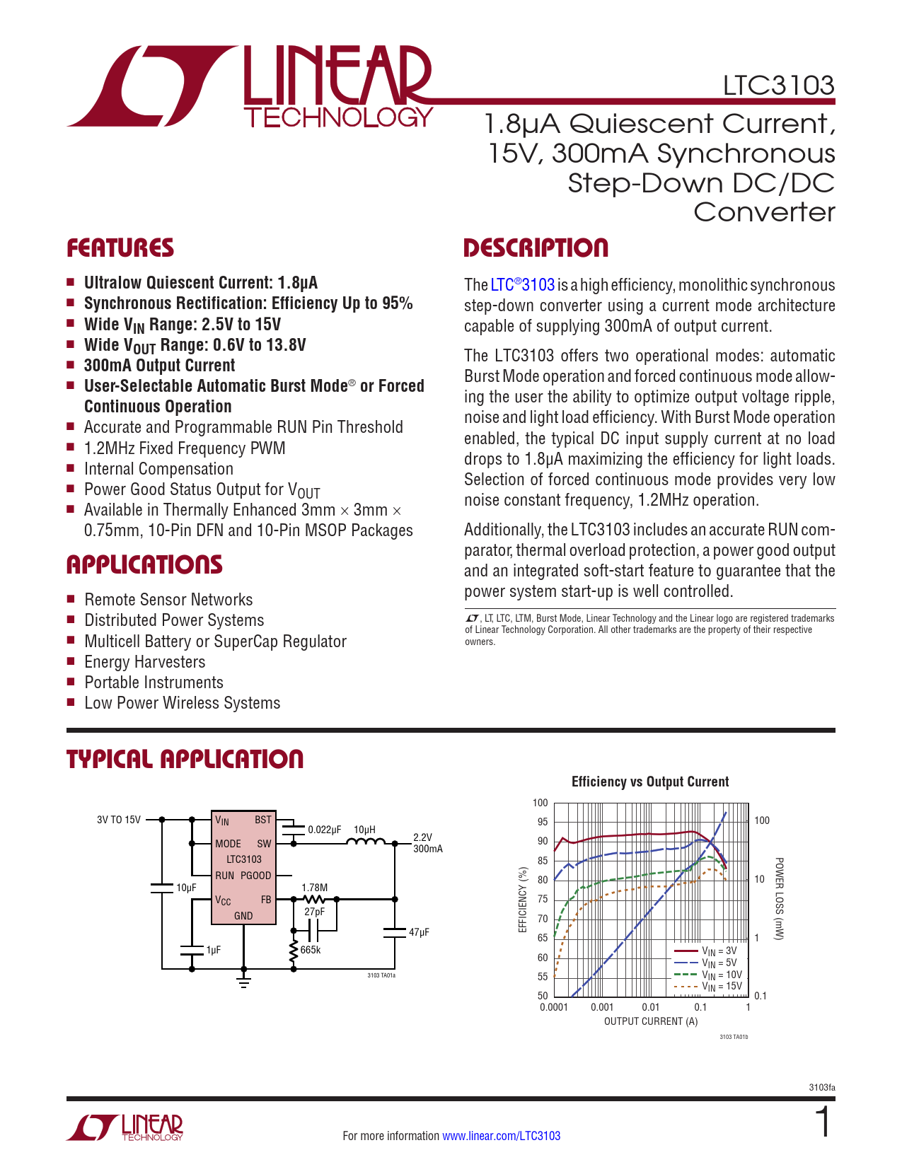 noise and light load efficiency. With Burst Mode operation n Accurate and Programmable RUN Pin Threshold enabled, the typical DC input supply current at no load n 1.2MHz Fixed Frequency PWM drops to 1.8µA maximizing the efficiency for light loads. n Internal Compensation Selection of forced continuous mode provides very low n Power Good Status Output for VOUT noise constant frequency, 1.2MHz operation. n Available in Thermally Enhanced 3mm × 3mm × 0.75mm, 10-Pin DFN and 10-Pin MSOP Packages Additionally, the LTC3103 includes an accurate RUN com- parator, thermal overload protection, a power good output