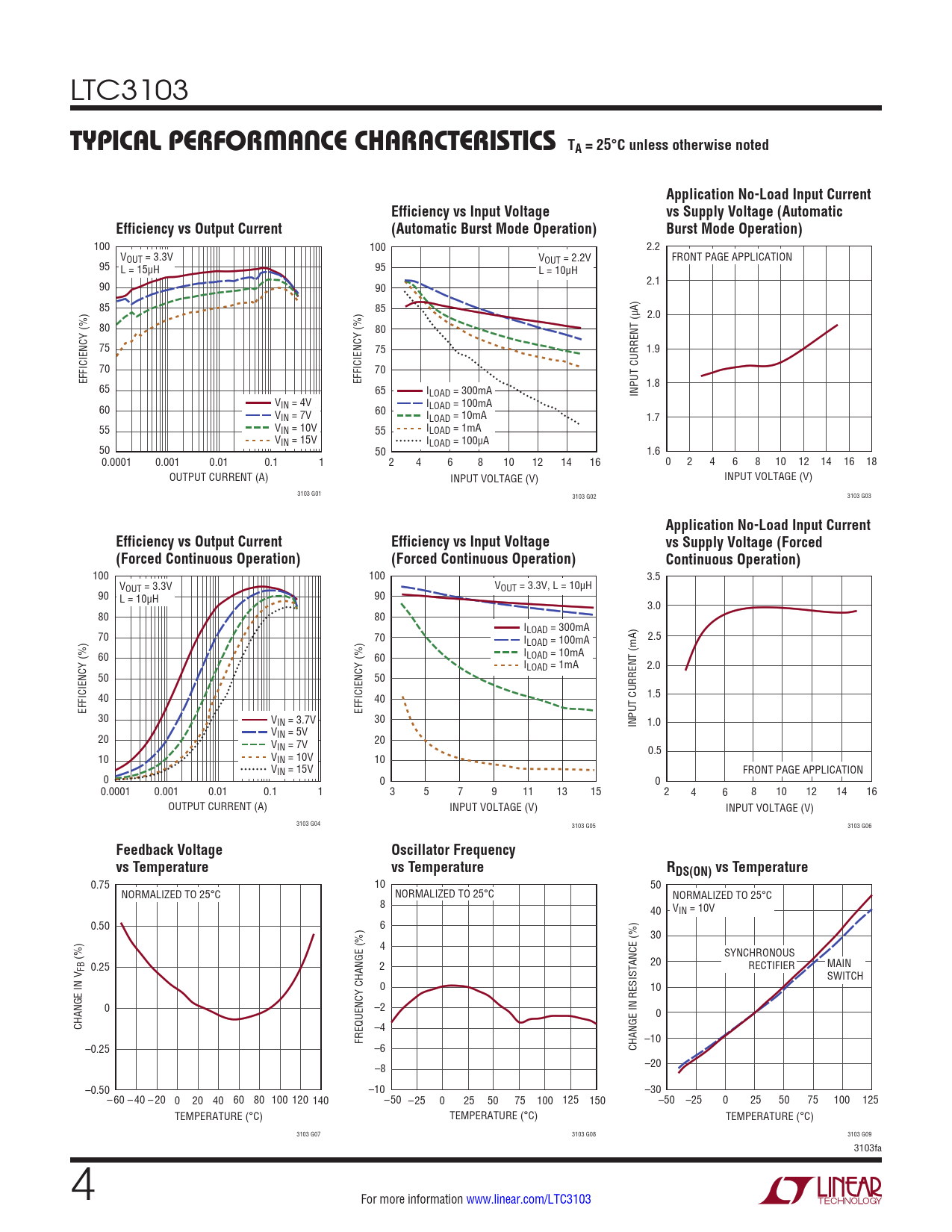 0.75 10 50 NORMALIZED TO 25°C NORMALIZED TO 25°C NORMALIZED TO 25°C 8 40 VIN = 10V 0.50 6 30 4 (%) SYNCHRONOUS 20 FB 0.25 2 RECTIFIER MAIN SWITCH 0 10 0 –2 0 CHANGE IN V –4 FREQUENCY CHANGE (%) –10 –0.25 –6 CHANGE IN RESISTANCE (%) –8 –20 –0.50 –10 –30 –60 –40 –20 0 20 40 60 80 100 120 140 –50 –25 0 25 50 75 100 125 150 –50 –25 0 25 50 75 100 125 TEMPERATURE (°C) TEMPERATURE (°C) TEMPERATURE (°C) 3103 G07 3103 G08 3103 G09 3103fa 4 For more information www.linear.com/LTC3103 Document Outline Features Applications Description Typical Application Absolute Maximum Ratings Pin Configuration Order Information Electrical Characteristics Pin Functions Block Diagram Operation Applications Information Typical Applications Package Description Typical Application Related Parts