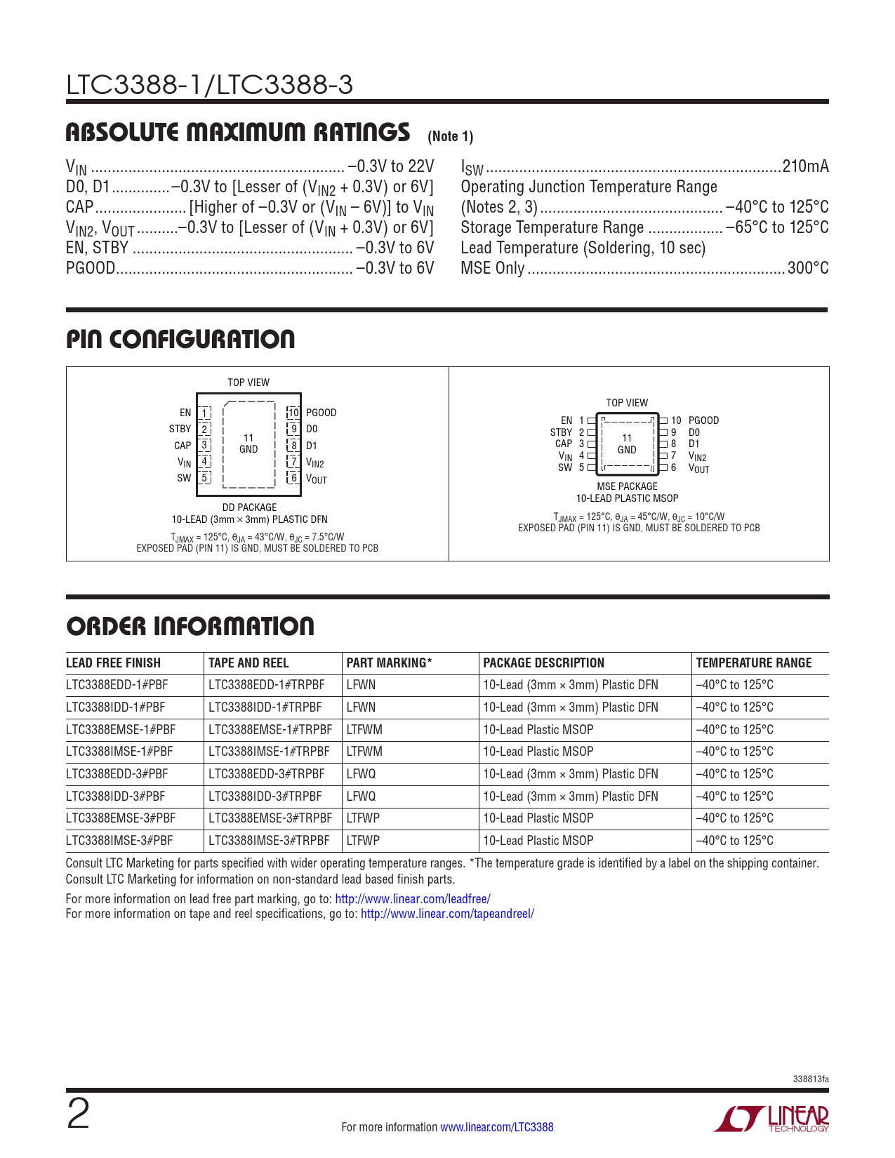 LTC3388EDD-1#PBF LTC3388EDD-1#TRPBF LFWN 10-Lead (3mm × 3mm) Plastic DFN –40°C to 125°C LTC3388IDD-1#PBF LTC3388IDD-1#TRPBF LFWN 10-Lead (3mm × 3mm) Plastic DFN –40°C to 125°C LTC3388EMSE-1#PBF LTC3388EMSE-1#TRPBF LTFWM 10-Lead Plastic MSOP –40°C to 125°C LTC3388IMSE-1#PBF LTC3388IMSE-1#TRPBF LTFWM 10-Lead Plastic MSOP –40°C to 125°C LTC3388EDD-3#PBF LTC3388EDD-3#TRPBF LFWQ 10-Lead (3mm × 3mm) Plastic DFN –40°C to 125°C LTC3388IDD-3#PBF LTC3388IDD-3#TRPBF LFWQ 10-Lead (3mm × 3mm) Plastic DFN –40°C to 125°C LTC3388EMSE-3#PBF LTC3388EMSE-3#TRPBF LTFWP 10-Lead Plastic MSOP –40°C to 125°C LTC3388IMSE-3#PBF LTC3388IMSE-3#TRPBF LTFWP 10-Lead Plastic MSOP –40°C to 125°C Consult LTC Marketing for parts specified with wider operating temperature ranges. *The temperature grade is identified by a label on the shipping container. Consult LTC Marketing for information on non-standard lead based finish parts. For more information on lead free part marking, go to: http://www.linear.com/leadfree/ For more information on tape and reel specifications, go to: http://www.linear.com/tapeandreel/ 338813fa 2 For more information www.linear.com/LTC3388 Document Outline Features Applications Description Typical Application Absolute Maximum Ratings Pin Configuration Order Information Electrical Characteristics Typical Performance Characteristics Pin Functions Block Diagram Operation Applications Information Typical Application Related Parts