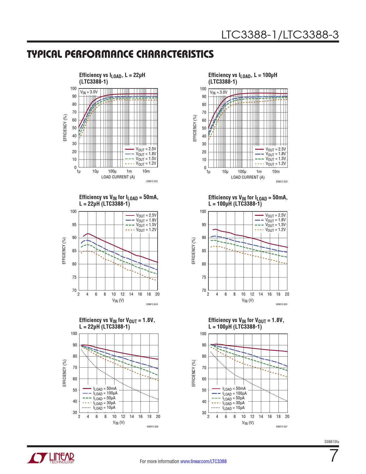 TYPICAL PERFORMANCE CHARACTERISTICS. Efficiency vs ILOAD, L = 22µH. Efficiency vs ILOAD, L = 100µH. (LTC3388-1)