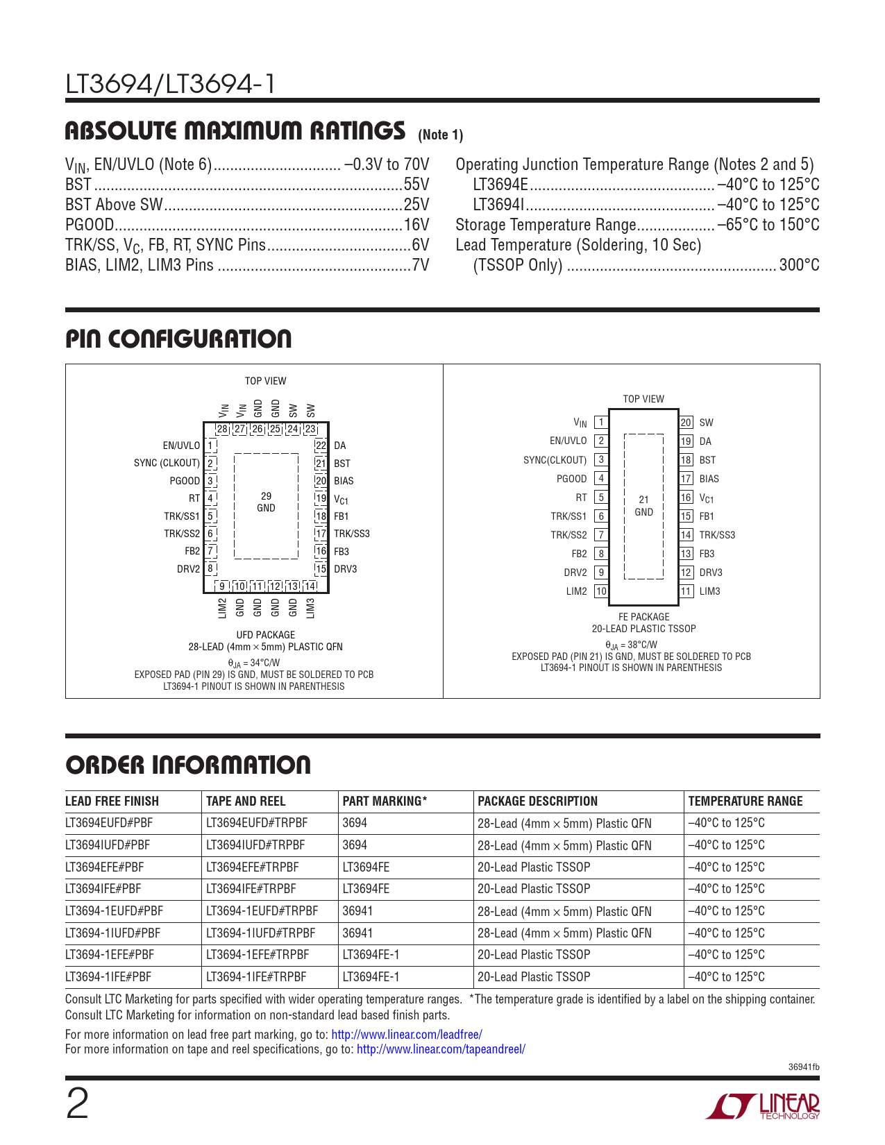 VIN, EN/UVLO (Note 6) ... –0.3V to 70V Operating Junction Temperature Range (Notes 2 and 5) BST ...55V LT3694E ... –40°C to 125°C BST Above SW ..25V LT3694I .. –40°C to 125°C PGOOD ..16V Storage Temperature Range ... –65°C to 150°C TRK/SS, VC, FB, RT, SYNC Pins ...6V Lead Temperature (Soldering, 10 Sec) BIAS, LIM2, LIM3 Pins ...7V (TSSOP Only) ... 300°C