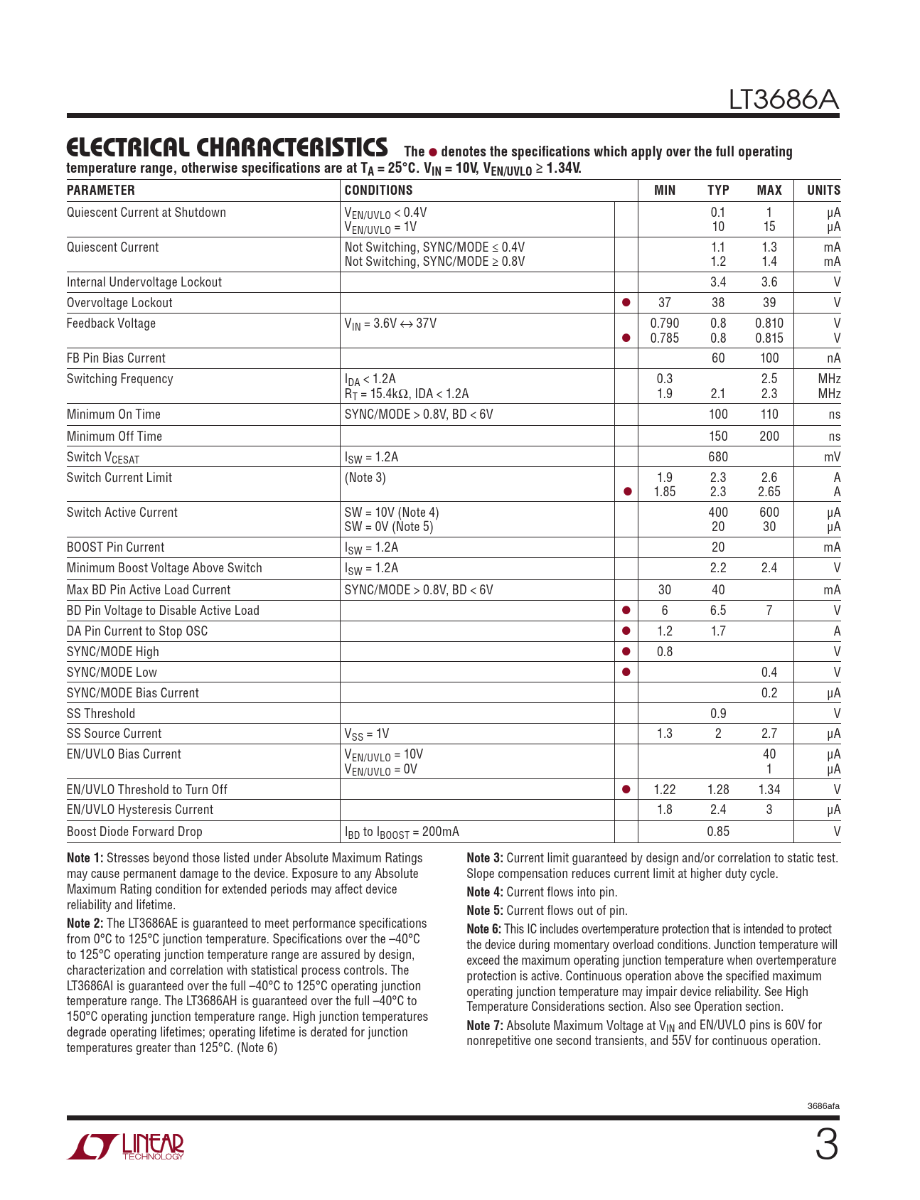 LT3686A electricAl chArActeristics The ● denotes the specifications which apply over the full operatingtemperature range, otherwise specifications are at TA = 25°C. VIN = 10V, VEN/UVLO ≥ 1.34V. PARAMETERCONDITIONSMINTYPMAXUNITS Quiescent Current at Shutdown VEN/UVLO < 0.4V 0.1 1 µA VEN/UVLO = 1V 10 15 µA Quiescent Current Not Switching, SYNC/MODE ≤ 0.4V 1.1 1.3 mA Not Switching, SYNC/MODE ≥ 0.8V 1.2 1.4 mA Internal Undervoltage Lockout 3.4 3.6 V Overvoltage Lockout ● 37 38 39 V Feedback Voltage VIN = 3.6V ↔ 37V 0.790 0.8 0.810 V ● 0.785 0.8 0.815 V FB Pin Bias Current 60 100 nA Switching Frequency IDA < 1.2A 0.3 2.5 MHz RT = 15.4kΩ, IDA < 1.2A 1.9 2.1 2.3 MHz Minimum On Time SYNC/MODE > 0.8V, BD < 6V 100 110 ns Minimum Off Time 150 200 ns Switch VCESAT ISW = 1.2A 680 mV Switch Current Limit (Note 3) 1.9 2.3 2.6 A ● 1.85 2.3 2.65 A Switch Active Current SW = 10V (Note 4) 400 600 µA SW = 0V (Note 5) 20 30 µA BOOST Pin Current ISW = 1.2A 20 mA Minimum Boost Voltage Above Switch ISW = 1.2A 2.2 2.4 V Max BD Pin Active Load Current SYNC/MODE > 0.8V, BD < 6V 30 40 mA BD Pin Voltage to Disable Active Load ● 6 6.5 7 V DA Pin Current to Stop OSC ● 1.2 1.7 A SYNC/MODE High ● 0.8 V SYNC/MODE Low ● 0.4 V SYNC/MODE Bias Current 0.2 µA SS Threshold 0.9 V SS Source Current VSS = 1V 1.3 2 2.7 µA EN/UVLO Bias Current VEN/UVLO = 10V 40 µA VEN/UVLO = 0V 1 µA EN/UVLO Threshold to Turn Off ● 1.22 1.28 1.34 V EN/UVLO Hysteresis Current 1.8 2.4 3 µA Boost Diode Forward Drop IBD to IBOOST = 200mA 0.85 V Note 1: Stresses beyond those listed under Absolute Maximum Ratings Note 3: Current limit guaranteed by design and/or correlation to static test. may cause permanent damage to the device. Exposure to any Absolute Slope compensation reduces current limit at higher duty cycle. Maximum Rating condition for extended periods may affect device Note 4: Current flows into pin. reliability and lifetime. Note 5: Current flows out of pin. Note 2: The LT3686AE is guaranteed to meet performance specifications Note 6: This IC includes overtemperature protection that is intended to protect from 0°C to 125°C junction temperature. Specifications over the –40°C the device during momentary overload conditions. Junction temperature will to 125°C operating junction temperature range are assured by design, exceed the maximum operating junction temperature when overtemperature characterization and correlation with statistical process controls. The protection is active. Continuous operation above the specified maximum LT3686AI is guaranteed over the full –40°C to 125°C operating junction operating junction temperature may impair device reliability. See High temperature range. The LT3686AH is guaranteed over the full –40°C to Temperature Considerations section. Also see Operation section. 150°C operating junction temperature range. High junction temperatures degrade operating lifetimes; operating lifetime is derated for junction Note 7: Absolute Maximum Voltage at VIN and EN/UVLO pins is 60V for temperatures greater than 125°C. (Note 6) nonrepetitive one second transients, and 55V for continuous operation. 3686afa 3 Document Outline Features Description Applications Typical Application Absolute Maximum Ratings Pin Configuration Order Information Electrical Characteristics Typical Performance Characteristics Pin Functions Block Diagram Operation Applications Information Typical Applications Package Description Revision History Typical Application Related Parts