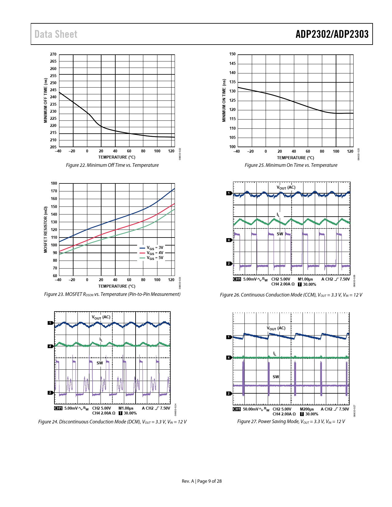 Línea de modelo para esta hoja de datos Versión de texto del documento Data Sheet ADP2302/ADP2303 270 150 265 145 260 140 255 s) n 250 s) 135 ( (n 245 IME 130 IME T F 240 T F N 125 O 235 M M O 230 120 IMU IMU N 225 N 115 MI MI 220 110 215 105 210 205 100 –40 –20 0 20 40 60 80 100 120 5 022–40 –20 0 20 40 60 80 100 120 02 33-TEMPERATURE (°C) 33- 88TEMPERATURE (°C) 0 088 Figure 22. Minimum Off Time vs. Temperature Figure 25. Minimum On Time vs. Temperature180 VOUT (AC) 170 1 160 ) 150 Ω m ( 140 I R L O 130 T S 120 ESI R SW T 110 E 4 SF 100 VGS = 3V MO 90 VGS = 4V V 80 GS = 5V 2 70 60–40 –20 0 20 40 60 80 100 120 23CH1 5.00mV B M1.00µs A CH2 7.50V 026 0W CH2 5.00V 3-TEMPERATURE (°C) CH4 2.00A Ω T 30.00% 83 08833- 08 Figure 23. MOSFET RDSON vs. Temperature (Pin-to-Pin Measurement) Figure 26. Continuous Conduction Mode (CCM), VOUT = 3.3 V, VIN = 12 VVOUT (AC) 1 VOUT (AC) I 1 L 4 IL 4 SW SW 2 2 24CH1 5.00mV B 0W CH2 5.00V M1.00µs A CH2 7.50V CH1 50.00mV BW CH2 5.00V M200µs A CH2 7.50V -027CH4 2.00A Ω 33-T 30.00% T 30.00% 088CH4 2.00A Ω 8833 0 Figure 24. Discontinuous Conduction Mode (DCM), VOUT = 3.3 V, VIN = 12 V Figure 27. Power Saving Mode, VOUT = 3.3 V, VIN = 12 V Rev. A | Page 9 of 28 Document Outline Features Applications Typical Applications Circuit General Description Revision History Specifications Absolute Maximum Ratings Thermal Resistance ESD Caution Pin Configuration and Function Descriptions Typical Performance Characteristics Functional Block Diagram Theory of Operation Basic Operation PWM Mode Power Saving Mode Bootstrap Circuitry Precision Enable Integrated Soft Start Current Limit Short-Circuit Protection Undervoltage Lockout (UVLO) Thermal Shutdown (TSD) Overvoltage Protection (OVP) Power Good Control Loop Applications Information ADIsimPower Design Tool Programming Output Voltage Voltage Conversion Limitations Low Input Voltage Considerations Programming the Precision Enable Inductor Catch Diode Input Capacitor Output Capacitor Thermal Consideration Design Example Catch Diode Selection Inductor Selection Output Capacitor Selection Resistive Voltage Divider Selection Circuit Board Layout Recommendations Typical Application Circuits Outline Dimensions Ordering Guide