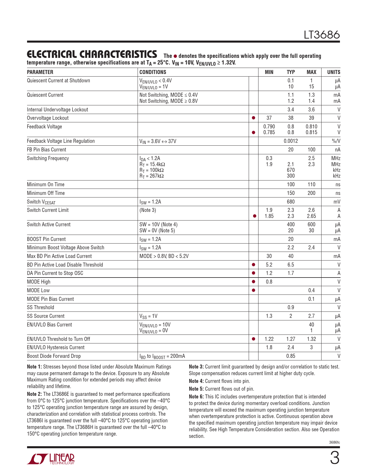 LT3686 electricAl chArActeristics The l denotes the specifications which apply over the full operatingtemperature range, otherwise specifications are at TA = 25°C. VIN = 10V, VEN/UVLO ≥ 1.32V. PARAMETERCONDITIONSMINTYPMAXUNITS Quiescent Current at Shutdown VEN/UVLO < 0.4V 0.1 1 µA VEN/UVLO = 1V 10 15 µA Quiescent Current Not Switching, MODE ≤ 0.4V 1.1 1.3 mA Not Switching, MODE ≥ 0.8V 1.2 1.4 mA Internal Undervoltage Lockout 3.4 3.6 V Overvoltage Lockout l 37 38 39 V Feedback Voltage 0.790 0.8 0.810 V l 0.785 0.8 0.815 V Feedback Voltage Line Regulation VIN = 3.6V ↔ 37V 0.0012 %/V FB Pin Bias Current 20 100 nA Switching Frequency IDA < 1.2A 0.3 2.5 MHz RT = 15.4kΩ 1.9 2.1 2.3 MHz RT = 100kΩ 670 kHz RT = 267kΩ 300 kHz Minimum On Time 100 110 ns Minimum Off Time 150 200 ns Switch VCESAT ISW = 1.2A 680 mV Switch Current Limit (Note 3) 1.9 2.3 2.6 A l 1.85 2.3 2.65 A Switch Active Current SW = 10V (Note 4) 400 600 µA SW = 0V (Note 5) 20 30 µA BOOST Pin Current ISW = 1.2A 20 mA Minimum Boost Voltage Above Switch ISW = 1.2A 2.2 2.4 V Max BD Pin Active Load Current MODE > 0.8V, BD < 5.2V 30 40 mA BD Pin Active Load Disable Threshold l 5.2 6.5 V DA Pin Current to Stop OSC l 1.2 1.7 A MODE High l 0.8 V MODE Low l 0.4 V MODE Pin Bias Current 0.1 µA SS Threshold 0.9 V SS Source Current VSS = 1V 1.3 2 2.7 µA EN/UVLO Bias Current VEN/UVLO = 10V 40 µA VEN/UVLO = 0V 1 µA EN/UVLO Threshold to Turn Off l 1.22 1.27 1.32 V EN/UVLO Hysteresis Current 1.8 2.4 3 µA Boost Diode Forward Drop IBD to IBOOST = 200mA 0.85 V Note 1: Stresses beyond those listed under Absolute Maximum Ratings Note 3: Current limit guaranteed by design and/or correlation to static test. may cause permanent damage to the device. Exposure to any Absolute Slope compensation reduces current limit at higher duty cycle. Maximum Rating condition for extended periods may affect device Note 4: Current flows into pin. reliability and lifetime. Note 5: Current flows out of pin. Note 2: The LT3686E is guaranteed to meet performance specifications Note 6: This IC includes overtemperature protection that is intended from 0°C to 125°C junction temperature. Specifications over the –40°C to protect the device during momentary overload conditions. Junction to 125°C operating junction temperature range are assured by design, temperature will exceed the maximum operating junction temperature characterization and correlation with statistical process controls. The when overtemperature protection is active. Continuous operation above LT3686I is guaranteed over the full –40°C to 125°C operating junction the specified maximum operating junction temperature may impair device temperature range. The LT3686H is guaranteed over the full –40°C to reliability. See High Temperature Consideration section. Also see Operation 150°C operating junction temperature range. section. 3686fc 3 Document Outline Features Applications Description Typical Application Absolute Maximum Ratings Pin Configuration Order Information Electrical Characteristics Typical Performance Characteristics Pin Functions Block Diagram Operation Applications Information Typical Applications Package Description Revision History Related Parts