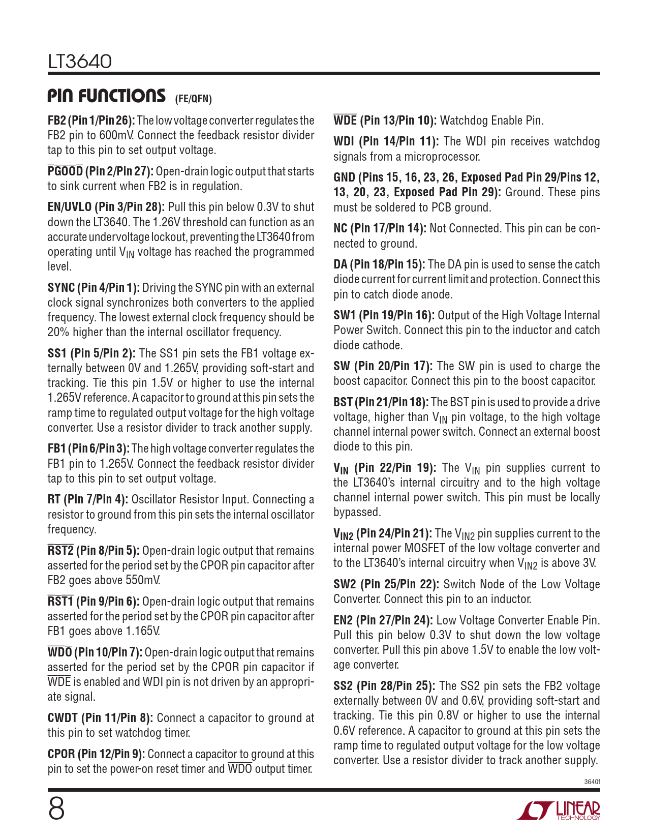 (FE/QFN) FB2 (Pin 1/Pin 26): WDE (Pin 13/Pin 10): WDI (Pin 14/Pin 11): PGOOD (Pin 2/Pin 27):