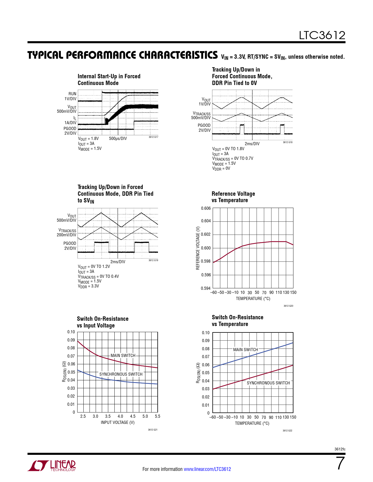 0.606 VOUT 500mV/DIV 0.604 VTRACK/SS 200mV/DIV 0.602 TAGE (V) PGOOD 2V/DIV 0.600 2ms/DIV 3612 G19 0.598 VOUT = 0V TO 1.2V REFERENCE VOL IOUT = 3A V 0.596 TRACK/SS = 0V TO 0.4V VMODE = 1.5V VDDR = 3.3V 0.594–60–50–30–10 10 30 50 70 90 110130150 TEMPERATURE (°C) 3612 G20