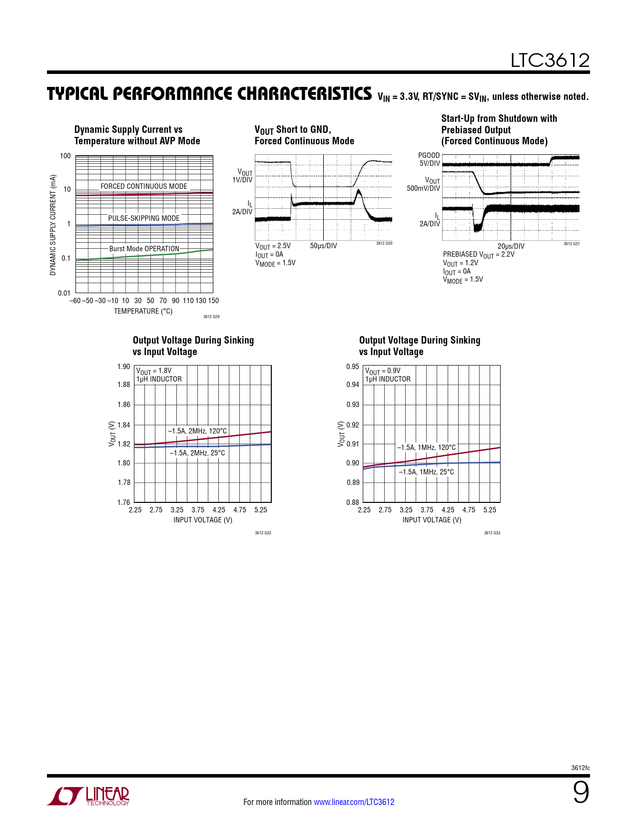 100 PGOOD 5V/DIV VOUT 1V/DIV VOUT 10 FORCED CONTINUOUS MODE 500mV/DIV IL 2A/DIV PULSE-SKIPPING MODE IL Y CURRENT (mA) 1 2A/DIV Burst Mode OPERATION 50µs/DIV 3612 G30 VOUT = 2.5V 20µs/DIV 3612 G31 0.1 IOUT = 0A PREBIASED VOUT = 2.2V VMODE = 1.5V VOUT = 1.2V DYNAMIC SUPPL IOUT = 0A VMODE = 1.5V 0.01–60–50–30–10 10 30 50 70 90 110130150 TEMPERATURE (°C) 3612 G29