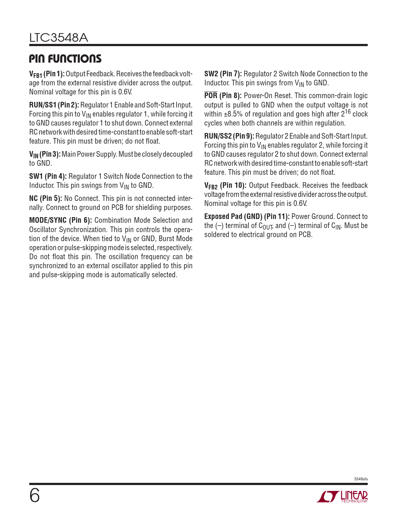 LTC3548A PIN FUNCTIONSVFB1 (Pin 1): Output Feedback. Receives the feedback volt- SW2 (Pin 7): Regulator 2 Switch Node Connection to the age from the external resistive divider across the output. Inductor. This pin swings from VIN to GND. Nominal voltage for this pin is 0.6V. POR (Pin 8): Power-On Reset. This common-drain logic RUN/SS1 (Pin 2): Regulator 1 Enable and Soft-Start Input. output is pulled to GND when the output voltage is not Forcing this pin to VIN enables regulator 1, while forcing it within ±8.5% of regulation and goes high after 216 clock to GND causes regulator 1 to shut down. Connect external cycles when both channels are within regulation. RC network with desired time-constant to enable soft-start RUN/SS2 (Pin 9): Regulator 2 Enable and Soft-Start Input. feature. This pin must be driven; do not float. Forcing this pin to VIN enables regulator 2, while forcing it VIN (Pin 3): Main Power Supply. Must be closely decoupled to GND causes regulator 2 to shut down. Connect external to GND. RC network with desired time-constant to enable soft-start feature. This pin must be driven; do not float. SW1 (Pin 4): Regulator 1 Switch Node Connection to the Inductor. This pin swings from VIN to GND. VFB2 (Pin 10): Output Feedback. Receives the feedback voltage from the external resistive divider across the output. NC (Pin 5): No Connect. This pin is not connected inter- Nominal voltage for this pin is 0.6V. nally. Connect to ground on PCB for shielding purposes. Exposed Pad (GND) (Pin 11): Power Ground. Connect to MODE/SYNC (Pin 6): Combination Mode Selection and the (–) terminal of C Oscillator Synchronization. This pin controls the opera- OUT, and (–) terminal of CIN. Must be soldered to electrical ground on PCB. tion of the device. When tied to VIN or GND, Burst Mode operation or pulse-skipping mode is selected, respectively. Do not float this pin. The oscillation frequency can be synchronized to an external oscillator applied to this pin and pulse-skipping mode is automatically selected. 3548afa 6
