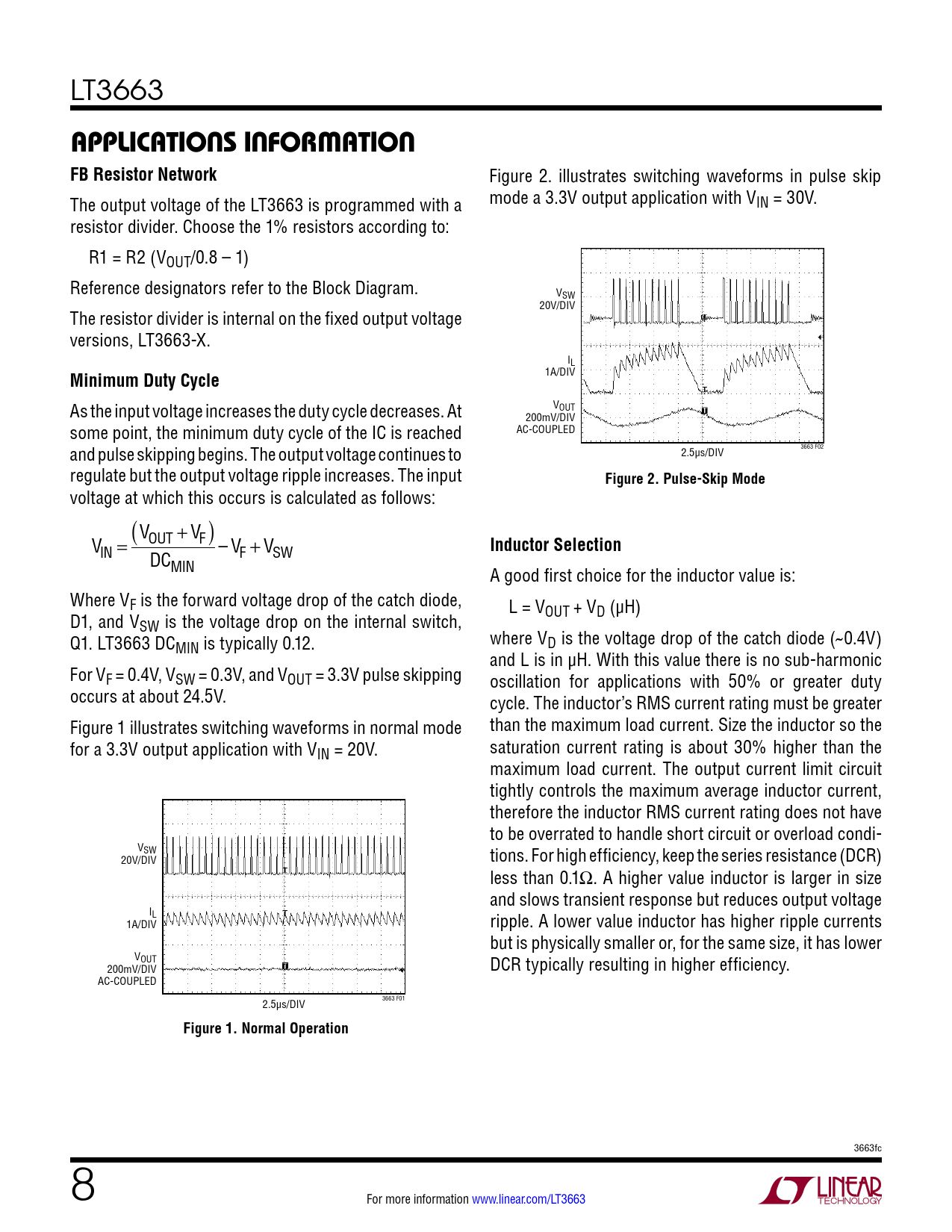 LT3663 applicaTions inForMaTionFB Resistor Network Figure 2. il ustrates switching waveforms in pulse skip The output voltage of the LT3663 is programmed with a mode a 3.3V output application with VIN = 30V. resistor divider. Choose the 1% resistors according to: R1 = R2 (VOUT/0.8 – 1) Reference designators refer to the Block Diagram. VSW 20V/DIV The resistor divider is internal on the fixed output voltage versions, LT3663-X. IL 1A/DIV Minimum Duty Cycle VOUT As the input voltage increases the duty cycle decreases. At 200mV/DIV AC-COUPLED some point, the minimum duty cycle of the IC is reached 2.5µs/DIV 3663 F02 and pulse skipping begins. The output voltage continues to regulate but the output voltage ripple increases. The input Figure 2. Pulse-Skip Mode voltage at which this occurs is calculated as fol ows: (V +V ) V OUT F = – V + V IN F SW Inductor Selection DCMIN A good first choice for the inductor value is: Where VF is the forward voltage drop of the catch diode, L = V D1, and V OUT + VD (µH) SW is the voltage drop on the internal switch, Q1. LT3663 DC where V MIN is typical y 0.12. D is the voltage drop of the catch diode (~0.4V) and L is in µH. With this value there is no sub-harmonic For VF = 0.4V, VSW = 0.3V, and VOUT = 3.3V pulse skipping oscil ation for applications with 50% or greater duty occurs at about 24.5V. cycle. The inductor’s RMS current rating must be greater Figure 1 il ustrates switching waveforms in normal mode than the maximum load current. Size the inductor so the for a 3.3V output application with VIN = 20V. saturation current rating is about 30% higher than the maximum load current. The output current limit circuit tightly controls the maximum average inductor current, therefore the inductor RMS current rating does not have to be overrated to handle short circuit or overload condi- VSW 20V/DIV tions. For high efficiency, keep the series resistance (DCR) less than 0.1Ω. A higher value inductor is larger in size and slows transient response but reduces output voltage IL 1A/DIV ripple. A lower value inductor has higher ripple currents but is physical y smal er or, for the same size, it has lower VOUT 200mV/DIV DCR typical y resulting in higher efficiency. AC-COUPLED 2.5µs/DIV 3663 F01 Figure 1. Normal Operation 3663fc 8 For more information www.linear.com/LT3663 Document Outline Description Typical Application Absolute Maximum Ratings Electrical Characteristics Typical Performance Characteristics Operation Applications Information Package Description