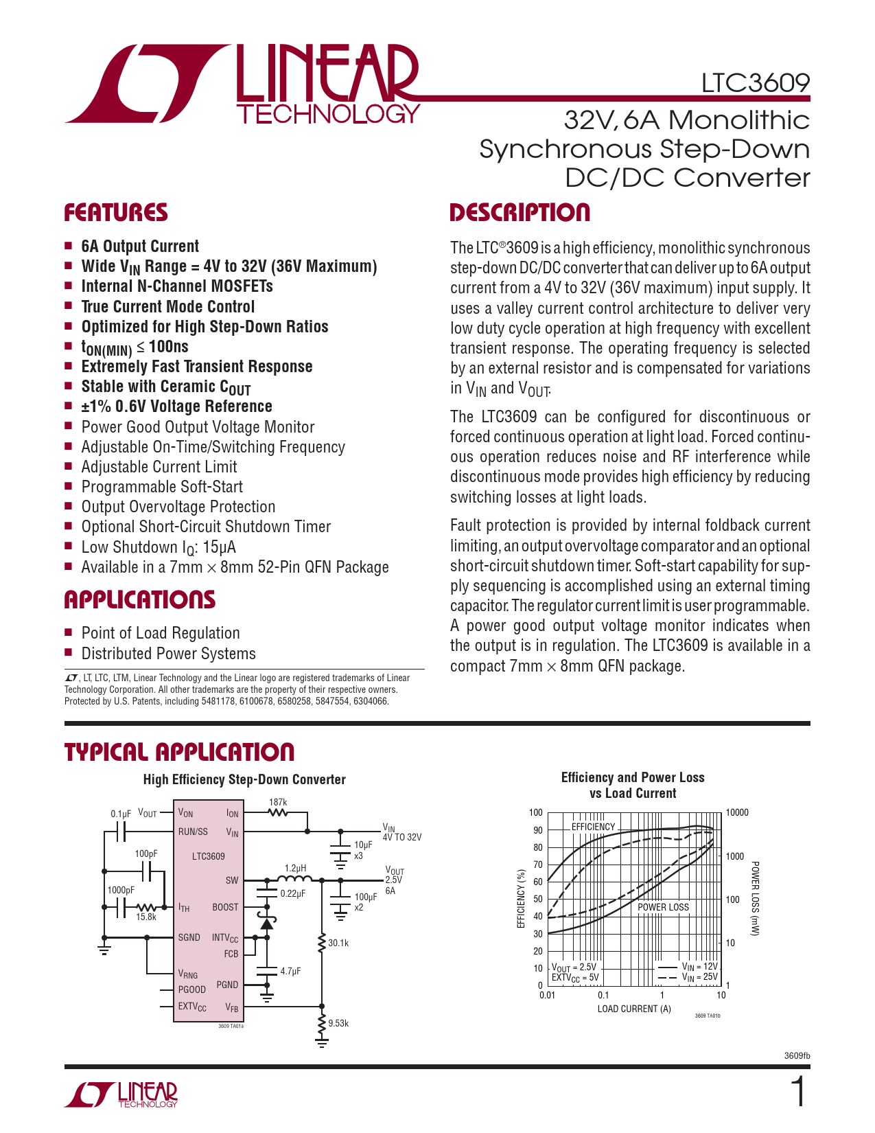 LTC3609 32V, 6A Monolithic Synchronous Step-Down DC/DC Converter FeaTures DescripTion n 6A Output Current The LTC®3609 is a high efficiency, monolithic synchronous n Wide VIN Range = 4V to 32V (36V Maximum) step-down DC/DC converter that can deliver up to 6A output n Internal N-Channel MOSFETs current from a 4V to 32V (36V maximum) input supply. It n True Current Mode Control uses a valley current control architecture to deliver very n Optimized for High Step-Down Ratios low duty cycle operation at high frequency with excellent n tON(MIN) ≤ 100ns transient response. The operating frequency is selected n Extremely Fast Transient Response by an external resistor and is compensated for variations n Stable with Ceramic COUT in VIN and VOUT. n ±1% 0.6V Voltage Reference The LTC3609 can be configured for discontinuous or n Power Good Output Voltage Monitor forced continuous operation at light load. Forced continu- n Adjustable On-Time/Switching Frequency ous operation reduces noise and RF interference while n Adjustable Current Limit discontinuous mode provides high efficiency by reducing n Programmable Soft-Start switching losses at light loads. n Output Overvoltage Protection n Optional Short-Circuit Shutdown Timer Fault protection is provided by internal foldback current n Low Shutdown I limiting, an output overvoltage comparator and an optional Q: 15µA n Available in a 7mm × 8mm 52-Pin QFN Package short-circuit shutdown timer. Soft-start capability for sup- applicaTions ply sequencing is accomplished using an external timing capacitor. The regulator current limit is user programmable. n A power good output voltage monitor indicates when Point of Load Regulation n the output is in regulation. The LTC3609 is available in a Distributed Power Systems compact 7mm × 8mm QFN package. L, LT, LTC, LTM, Linear Technology and the Linear logo are registered trademarks of Linear Technology Corporation. All other trademarks are the property of their respective owners. Protected by U.S. Patents, including 5481178, 6100678, 6580258, 5847554, 6304066. Typical applicaTion High Efficiency Step-Down ConverterEfficiency and Power Loss vs Load Current 187k 0.1µF VOUT VON ION 100 10000 VIN RUN/SS V EFFICIENCY IN 90 4V TO 32V 10µF 80 100pF LTC3609 x3 1000 POWER LOSS (mW) 1.2µH V 70 OUT SW 2.5V 60 1000pF 6A 0.22µF 100µF 50 100 ITH BOOST x2 POWER LOSS 15.8k 40 EFFICIENCY (%) SGND INTV 30 CC 30.1k 10 FCB 20 V V V 4.7µF 10 OUT = 2.5V IN = 12V RNG EXTV V PGND CC = 5V IN = 25V PGOOD 0 1 0.01 0.1 1 10 EXTVCC VFB LOAD CURRENT (A) 3609 TA01b 3609 TA01a 9.53k 3609fb Document Outline Features Description Applications Typical Application Absolute Maximum Ratings Pin Configuration order information Electrical Characteristics Typical Performance Characteristics Pin Functions Functional Diagram Operation Applications Information Typical Applications Package Description Revision History Typical Application Related Parts
