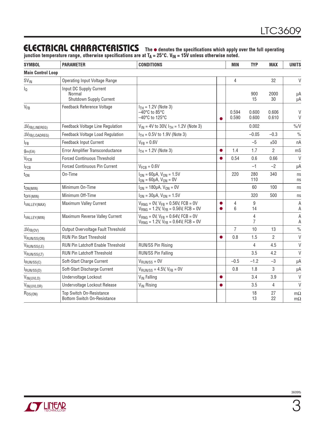 SVIN Operating Input Voltage Range 4 32 V IQ Input DC Supply Current Normal 900 2000 µA Shutdown Supply Current 15 30 µA VFB Feedback Reference Voltage ITH = 1.2V (Note 3) –40°C to 85°C 0.594 0.600 0.606 V –40°C to 125°C l 0.590 0.600 0.610 V ∆VFB(LINEREG) Feedback Voltage Line Regulation VIN = 4V to 30V, ITH = 1.2V (Note 3) 0.002 %/V ∆VFB(LOADREG) Feedback Voltage Load Regulation ITH = 0.5V to 1.9V (Note 3) –0.05 –0.3 % IFB Feedback Input Current VFB = 0.6V –5 ±50 nA gm(EA) Error Amplifier Transconductance ITH = 1.2V (Note 3) l 1.4 1.7 2 mS VFCB Forced Continuous Threshold l 0.54 0.6 0.66 V IFCB Forced Continuous Pin Current VFCB = 0.6V –1 –2 µA tON On-Time ION = 60µA, VON = 1.5V 220 280 340 ns ION = 60µA, VON = 0V 110 ns tON(MIN) Minimum On-Time ION = 180µA, VON = 0V 60 100 ns tOFF(MIN) Minimum Off-Time ION = 30µA, VON = 1.5V 320 500 ns IVALLEY(MAX) Maximum Valley Current VRNG = 0V, VFB = 0.56V, FCB = 0V l 4 9 A VRNG = 1.2V, VFB = 0.56V, FCB = 0V l 6 14 A IVALLEY(MIN) Maximum Reverse Valley Current VRNG = 0V, VFB = 0.64V, FCB = 0V 4 A VRNG = 1.2V, VFB = 0.64V, FCB = 0V 7 A ∆VFB(OV) Output Overvoltage Fault Threshold 7 10 13 % VRUN/SS(ON) RUN Pin Start Threshold l 0.8 1.5 2 V VRUN/SS(LE) RUN Pin Latchoff Enable Threshold RUN/SS Pin Rising 4 4.5 V VRUN/SS(LT) RUN Pin Latchoff Threshold RUN/SS Pin Falling 3.5 4.2 V IRUN/SS(C) Soft-Start Charge Current VRUN/SS = 0V –0.5 –1.2 –3 µA IRUN/SS(D) Soft-Start Discharge Current VRUN/SS = 4.5V, VFB = 0V 0.8 1.8 3 µA VIN(UVLO) Undervoltage Lockout VIN Falling l 3.4 3.9 V VIN(UVLOR) Undervoltage Lockout Release VIN Rising l 3.5 4 V RDS(ON) Top Switch On-Resistance 18 27 mΩ Bottom Switch On-Resistance 13 22 mΩ 3609fb Document Outline Features Description Applications Typical Application Absolute Maximum Ratings Pin Configuration order information Electrical Characteristics Typical Performance Characteristics Pin Functions Functional Diagram Operation Applications Information Typical Applications Package Description Revision History Typical Application Related Parts