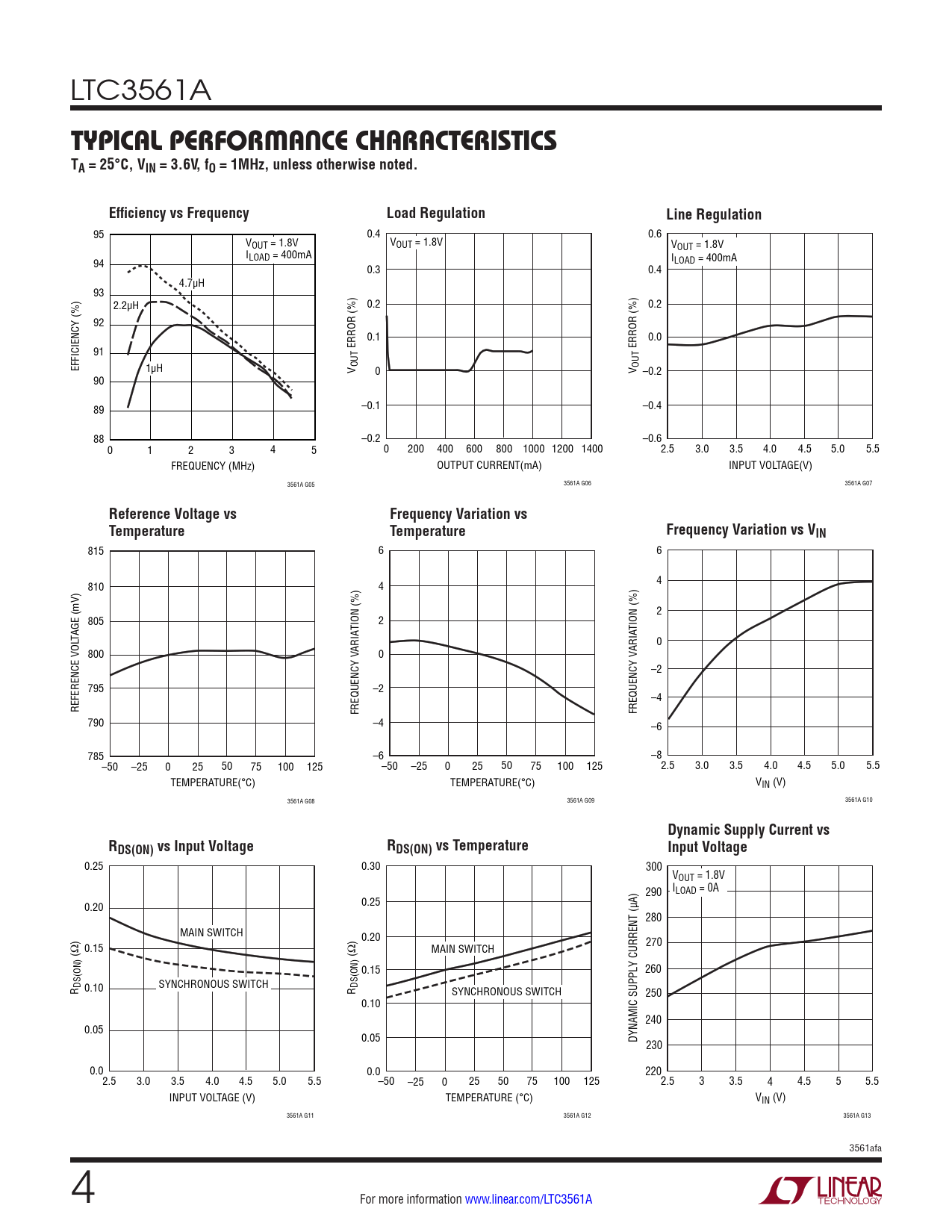 95 0.4 0.6 VOUT = 1.8V VOUT = 1.8V VOUT = 1.8V I 94 LOAD = 400mA ILOAD = 400mA 0.3 0.4 4.7µH 93 2.2µH 0.2 0.2 92 0.1 0.0 91 ERROR (%) ERROR (%) EFFICIENCY (%) 1µH V OUT 0 V OUT –0.2 90 89 –0.1 –0.4 88 –0.2 –0.6 0 1 2 3 4 5 0 200 400 600 800 1000 1200 1400 2.5 3.0 3.5 4.0 4.5 5.0 5.5 FREQUENCY (MHz) OUTPUT CURRENT(mA) INPUT VOLTAGE(V) 3561A G05 3561A G06 3561A G07