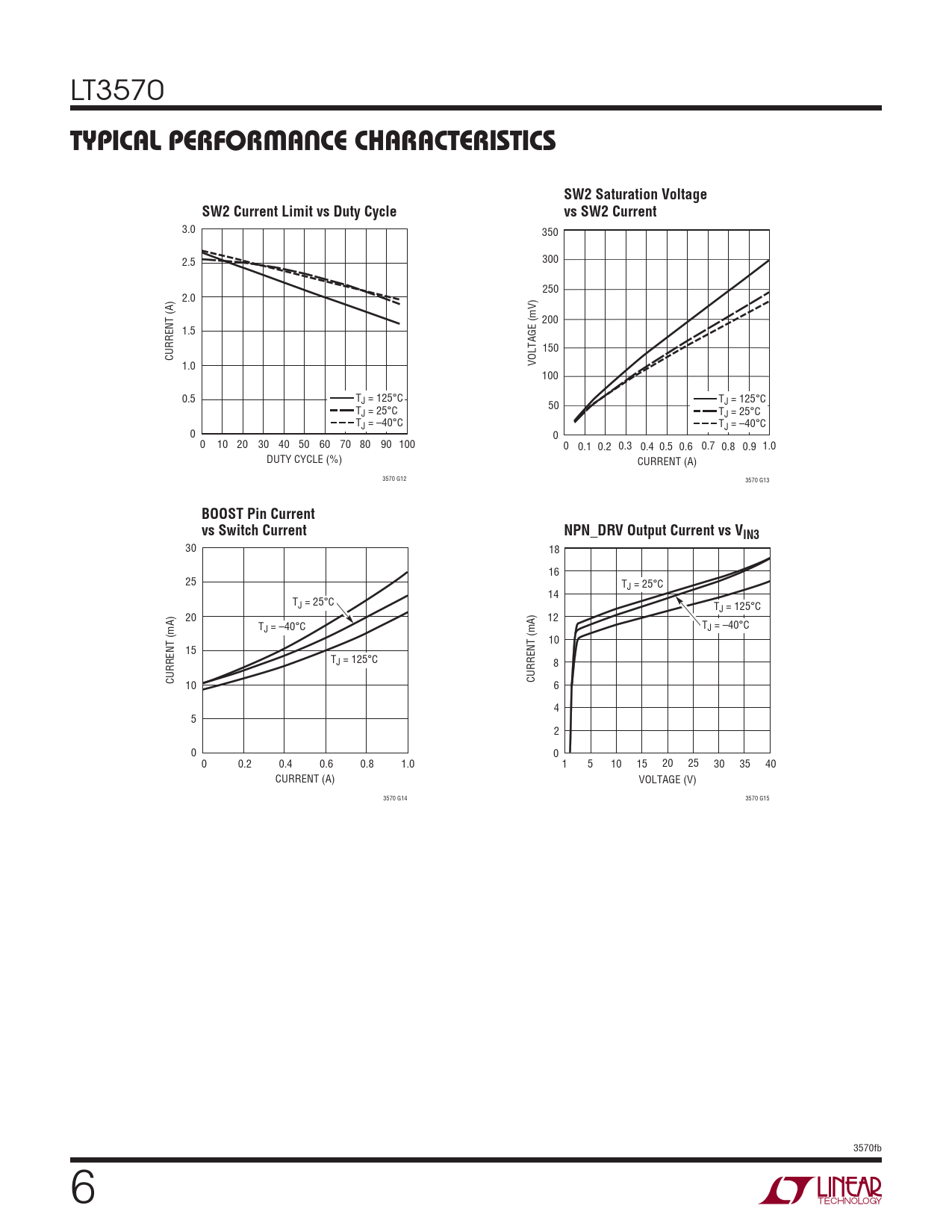 30 18 16 25 TJ = 25°C 14 TJ = 25°C TJ = 125°C 20 12 T T J = –40°C J = –40°C 10 15 TJ = 125°C 8 CURRENT (mA) CURRENT (mA) 10 6 4 5 2 0 0 0 0.2 0.4 0.6 0.8 1.0 1 5 10 15 20 25 30 35 40 CURRENT (A) VOLTAGE (V) 3570 G14 3570 G15 3570fb 6