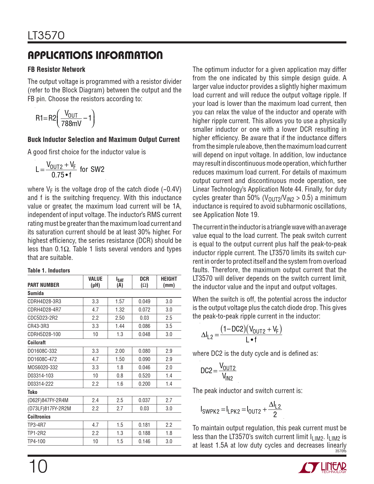 APPLICATIONS INFORMATION FB Resistor Network. Buck Inductor Selection and Maximum Output Current. Table 1. Inductors. VALUE