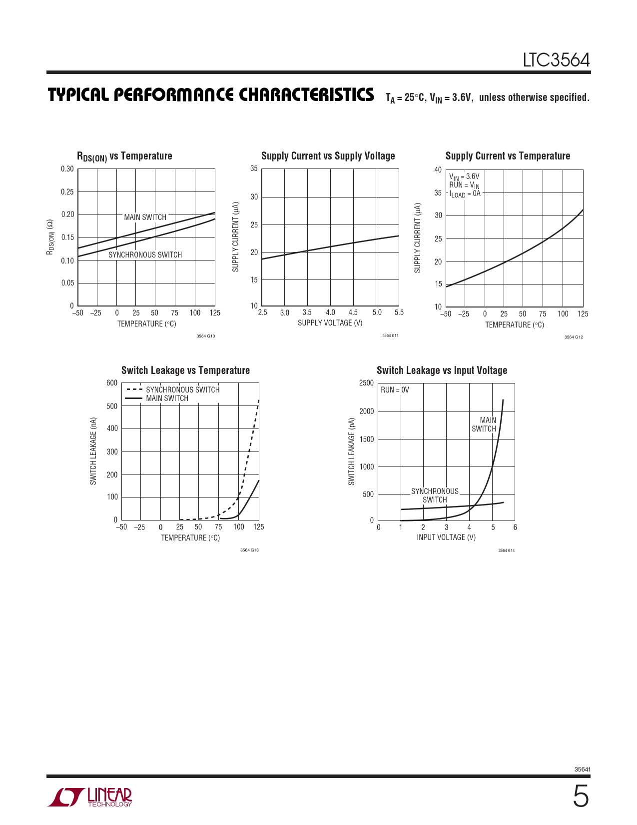 600 2500 SYNCHRONOUS SWITCH RUN = 0V MAIN SWITCH 500 2000 MAIN 400 SWITCH 1500 300 1000 200 SWITCH LEAKAGE (nA) SWITCH LEAKAGE (pA) SYNCHRONOUS 100 500 SWITCH 0 0 –50 –25 0 25 50 75 100 125 0 1 2 3 4 5 6 TEMPERATURE (°C) INPUT VOLTAGE (V) 3564 G13 3564 G14 3564f 5