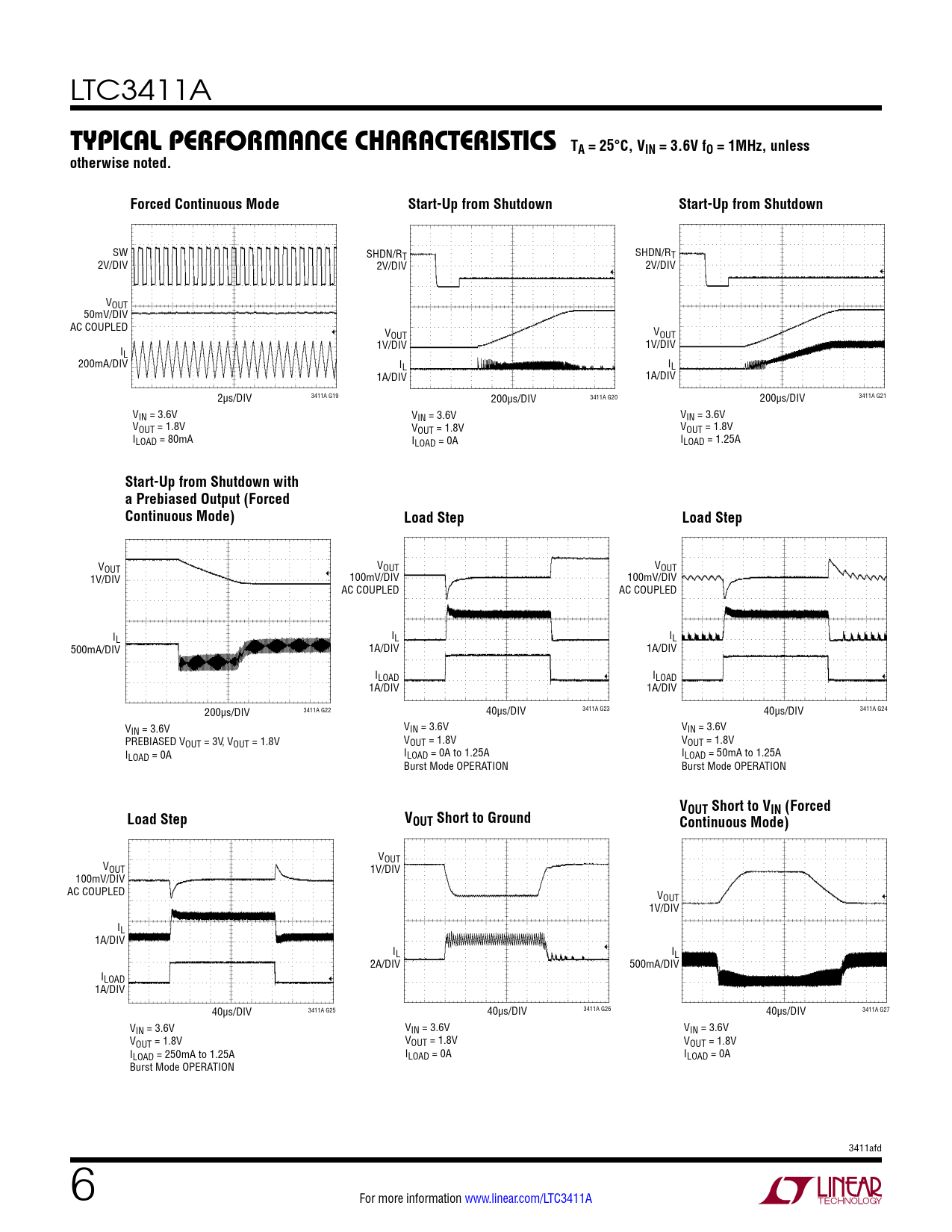 VOUT VOUT VOUT 1V/DIV 100mV/DIV 100mV/DIV AC COUPLED AC COUPLED IL IL IL 500mA/DIV 1A/DIV 1A/DIV ILOAD ILOAD 1A/DIV 1A/DIV 3411A G22 200µs/DIV 3411A G23 40µs/DIV 3411A G24 40µs/DIV VIN = 3.6V VIN = 3.6V VIN = 3.6V PREBIASED VOUT = 3V, VOUT = 1.8V VOUT = 1.8V VOUT = 1.8V ILOAD = 0A ILOAD = 0A to 1.25A ILOAD = 50mA to 1.25A Burst Mode OPERATION Burst Mode OPERATION