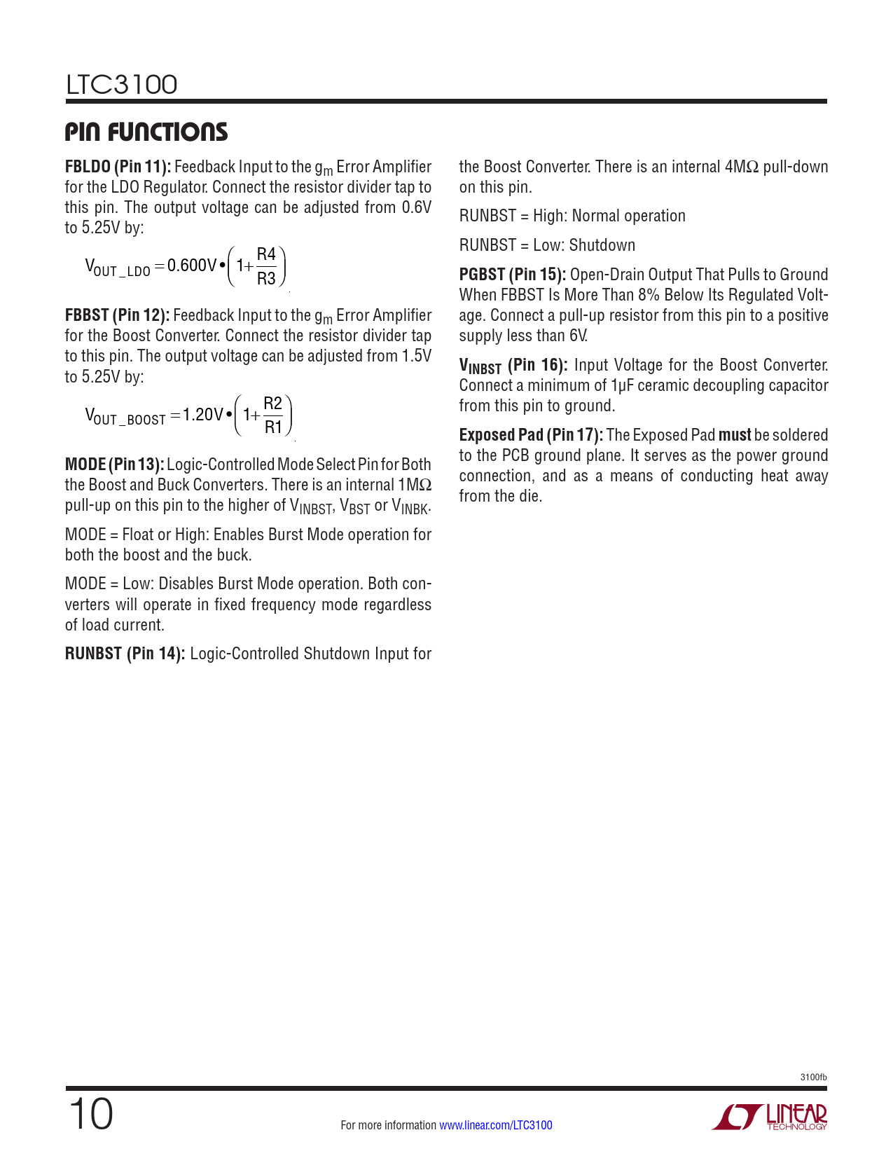 LTC3100 PIN FUNCTIONSFBLDO (Pin 11): Feedback Input to the gm Error Amplifier the Boost Converter. There is an internal 4MΩ pull-down for the LDO Regulator. Connect the resistor divider tap to on this pin. this pin. The output voltage can be adjusted from 0.6V RUNBST = High: Normal operation to 5.25V by: RUNBST = Low: Shutdown R4 V OUT _LDO = 0.600V • 1+ PGBST (Pin 15): Open-Drain Output That Pulls to Ground R3 When FBBST Is More Than 8% Below Its Regulated Volt- FBBST (Pin 12): Feedback Input to the gm Error Amplifier age. Connect a pull-up resistor from this pin to a positive for the Boost Converter. Connect the resistor divider tap supply less than 6V. to this pin. The output voltage can be adjusted from 1.5V V to 5.25V by: INBST (Pin 16): Input Voltage for the Boost Converter. Connect a minimum of 1µF ceramic decoupling capacitor R2 V from this pin to ground. OUT _BOOST = 1.20V • 1+ R1 Exposed Pad (Pin 17): The Exposed Pad must be soldered MODE (Pin 13): Logic-Controlled Mode Select Pin for Both to the PCB ground plane. It serves as the power ground the Boost and Buck Converters. There is an internal 1MΩ connection, and as a means of conducting heat away pull-up on this pin to the higher of V from the die. INBST, VBST or VINBK. MODE = Float or High: Enables Burst Mode operation for both the boost and the buck. MODE = Low: Disables Burst Mode operation. Both con- verters will operate in fixed frequency mode regardless of load current. RUNBST (Pin 14): Logic-Controlled Shutdown Input for 3100fb 10 For more information www.linear.com/LTC3100 Document Outline Features Description Applications Typical Application Absolute Maximum Ratings Pin Configuration Order Information Electrical Characteristics Typical Performance Characteristics Pin Functions Block Diagram Operation Applications Information Typical Applications Package Description Typical Application Related Parts
