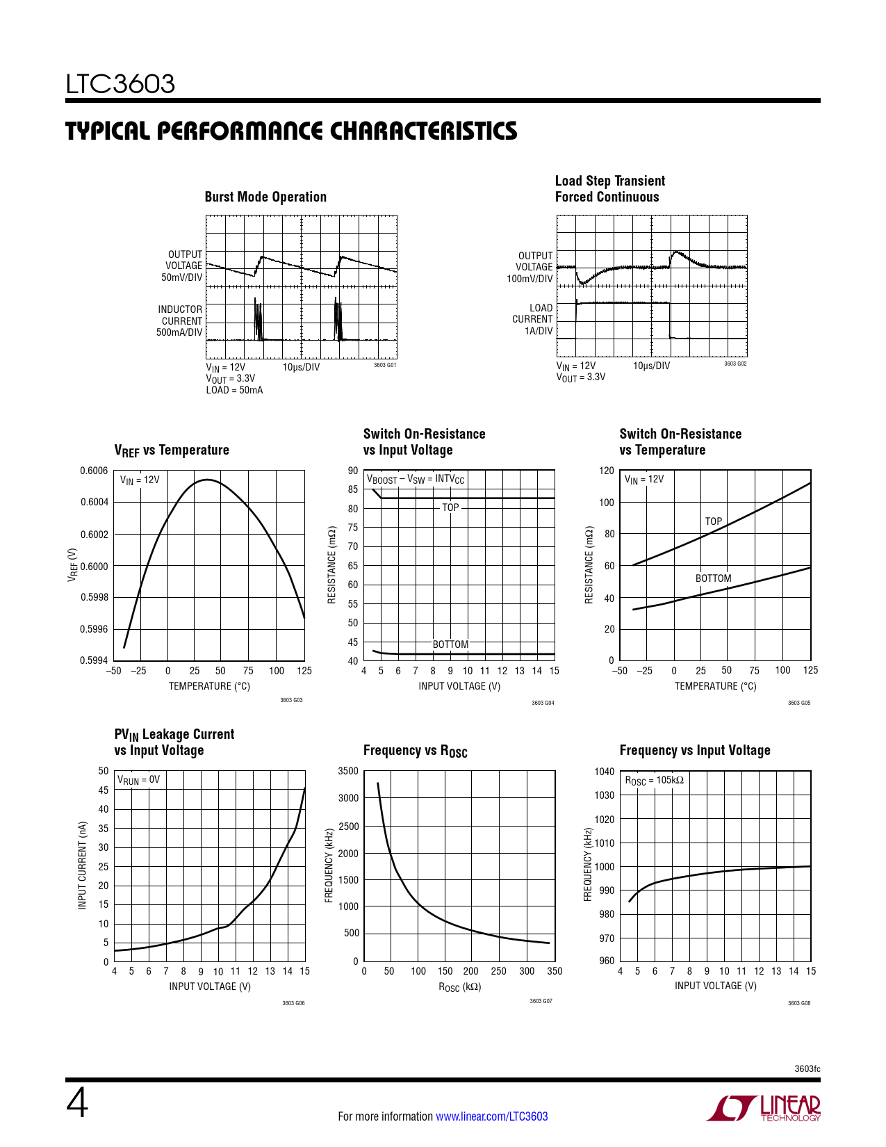 0.6006 90 120 VIN = 12V VBOOST – VSW = INTVCC VIN = 12V 85 0.6004 80 TOP 100 75 TOP 0.6002 80 70 (V) 0.6000 65 60 V REF 60 BOTTOM 0.5998 RESISTANCE (mΩ) 55 RESISTANCE (mΩ) 40 0.5996 50 20 45 BOTTOM 0.5994 40 0 –50 –25 0 25 50 75 100 125 4 5 6 7 8 9 10 11 12 13 14 15 –50 –25 0 25 50 75 100 125 TEMPERATURE (°C) INPUT VOLTAGE (V) TEMPERATURE (°C) 3603 G03 3603 G04 3603 G05
