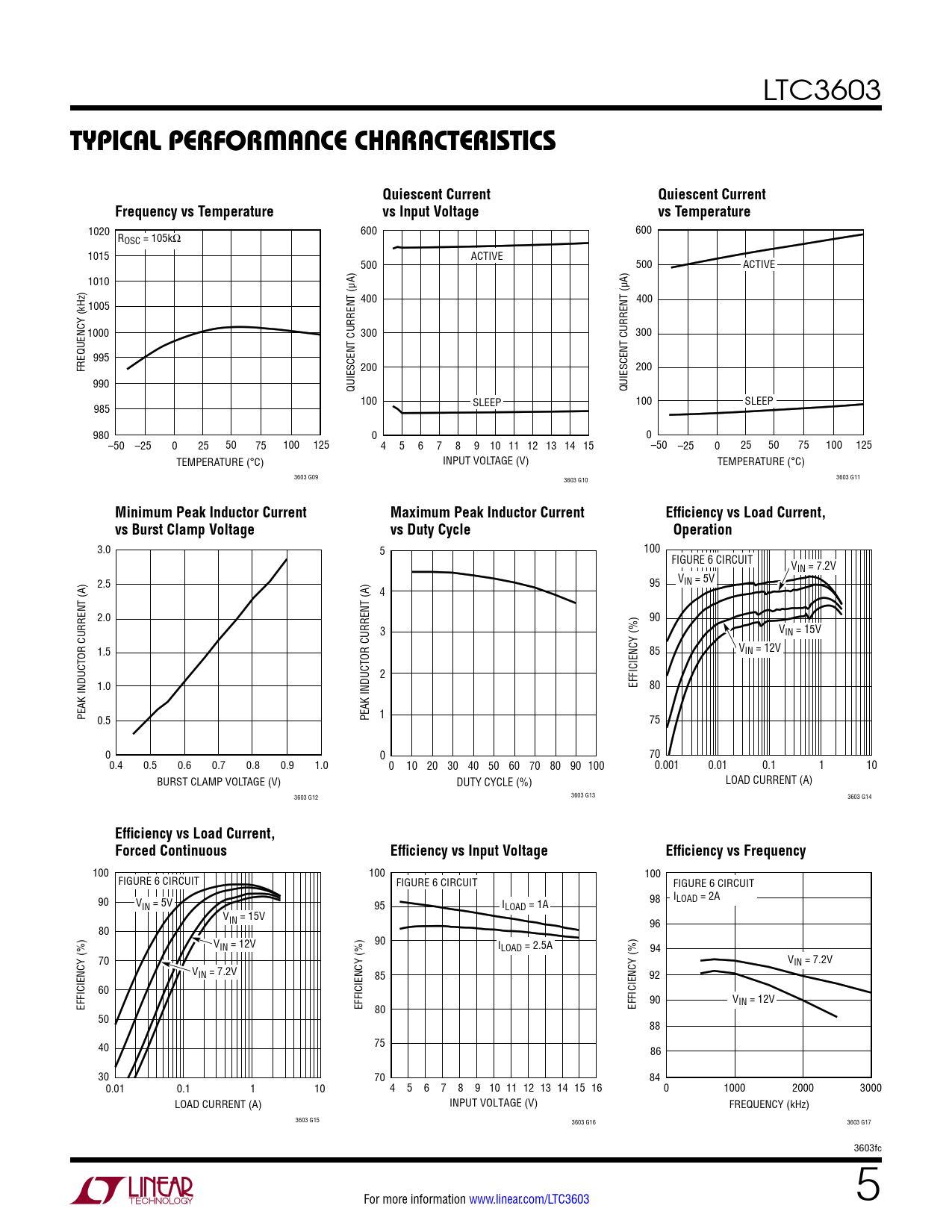1020 600 600 ROSC = 105kΩ 1015 ACTIVE 500 500 ACTIVE 1010 400 400 1005 1000 300 300 995 FREQUENCY (kHz) 200 200 990 QUIESCENT CURRENT (µA) QUIESCENT CURRENT (µA) 100 SLEEP 100 SLEEP 985 980 0 0 –50 –25 0 25 50 75 100 125 4 5 6 7 8 9 10 11 12 13 14 15 –50 –25 0 25 50 75 100 125 TEMPERATURE (°C) INPUT VOLTAGE (V) TEMPERATURE (°C) 3603 G09 3603 G10 3603 G11