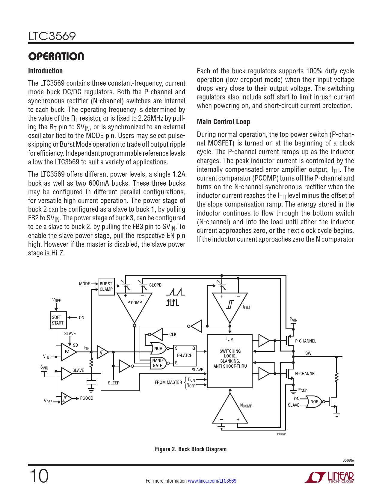 ing the RT pin to SVIN, or is synchronized to an external oscillator tied to the MODE pin. Users may select pulse- During normal operation, the top power switch (P-chan- skipping or Burst Mode operation to trade off output ripple nel MOSFET) is turned on at the beginning of a clock for efficiency. Independent programmable reference levels cycle. The P-channel current ramps up as the inductor allow the LTC3569 to suit a variety of applications. charges. The peak inductor current is controlled by the internally compensated error amplifier output, I The LTC3569 offers different power levels, a single 1.2A TH. The current comparator (PCOMP) turns off the P-channel and buck as well as two 600mA bucks. These three bucks turns on the N-channel synchronous rectifier when the may be configured in different parallel configurations, inductor current reaches the I for versatile high current operation. The power stage of TH level minus the offset of the slope compensation ramp. The energy stored in the buck 2 can be configured as a slave to buck 1, by pulling inductor continues to flow through the bottom switch FB2 to SVIN. The power stage of buck 3, can be configured (N-channel) and into the load until either the inductor to be a slave to buck 2, by pulling the FB3 pin to SVIN. To current approaches zero, or the next clock cycle begins. enable the slave power stage, pull the respective EN pin If the inductor current approaches zero the N comparator high. However if the master is disabled, the slave power stage is Hi-Z. MODE BURST SLOPE CLAMP + – + – VREF P COMP ILIM SOFT ON PVIN START SLAVE CLK ILIM P-CHANNEL SD ITH NOR S Q EA EA SWITCHING V P-LATCH FB LOGIC, SW NAND BLANKING, R S GATE ANTI SHOOT-THRU VIN SLAVE SLAVE N-CHANNEL PON SLEEP FROM MASTER NOFF PGND PGOOD ON VREF NOR NCOMP SLAVE – + 3569 F02