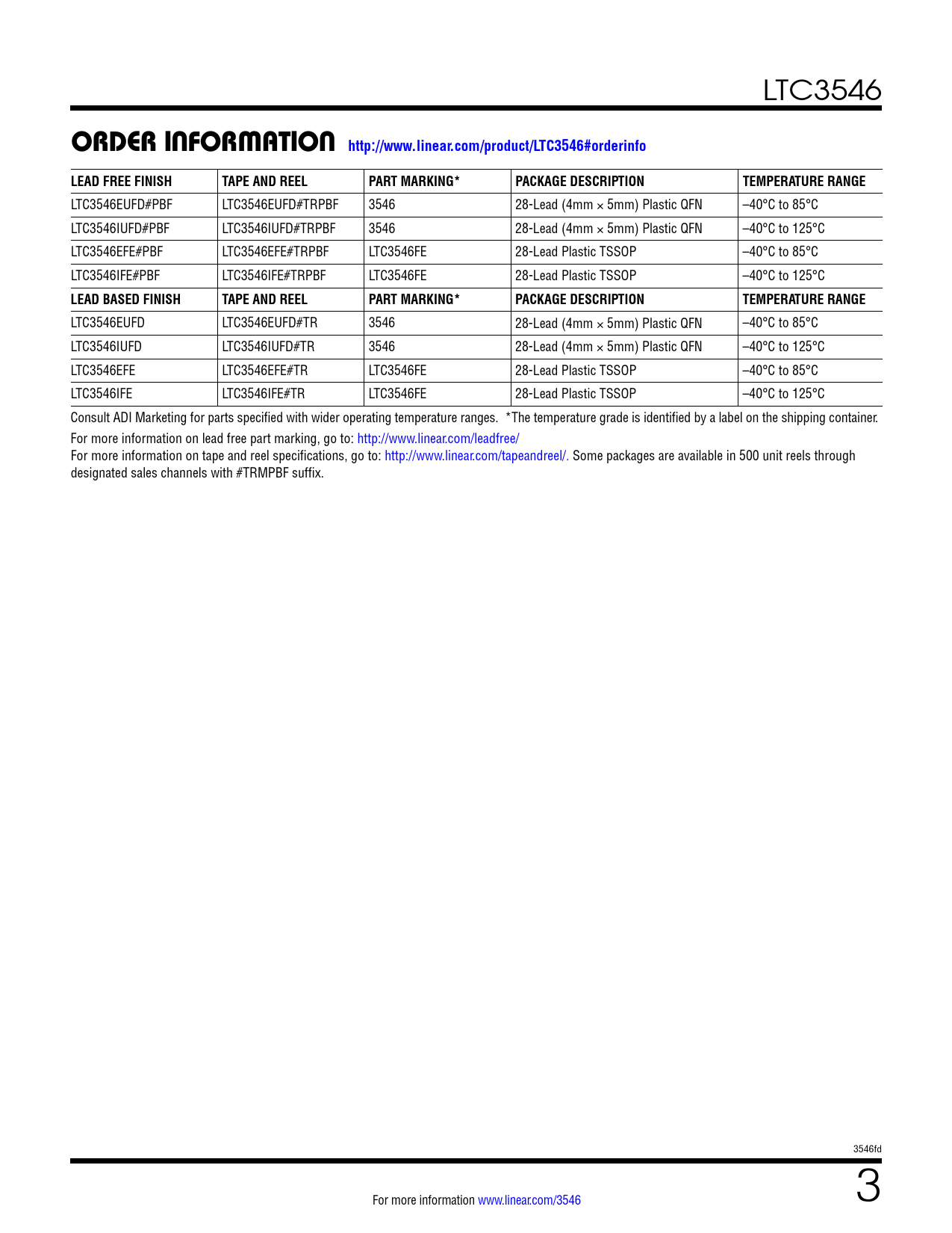 LTC3546 ORDER INFORMATION http://www.linear.com/product/LTC3546#orderinfoLEAD FREE FINISHTAPE AND REELPART MARKING*PACKAGE DESCRIPTIONTEMPERATURE RANGE LTC3546EUFD#PBF LTC3546EUFD#TRPBF 3546 28-Lead (4mm × 5mm) Plastic QFN –40°C to 85°C LTC3546IUFD#PBF LTC3546IUFD#TRPBF 3546 28-Lead (4mm × 5mm) Plastic QFN –40°C to 125°C LTC3546EFE#PBF LTC3546EFE#TRPBF LTC3546FE 28-Lead Plastic TSSOP –40°C to 85°C LTC3546IFE#PBF LTC3546IFE#TRPBF LTC3546FE 28-Lead Plastic TSSOP –40°C to 125°C LEAD BASED FINISHTAPE AND REELPART MARKING*PACKAGE DESCRIPTIONTEMPERATURE RANGE LTC3546EUFD LTC3546EUFD#TR 3546 28-Lead (4mm × 5mm) Plastic QFN –40°C to 85°C LTC3546IUFD LTC3546IUFD#TR 3546 28-Lead (4mm × 5mm) Plastic QFN –40°C to 125°C LTC3546EFE LTC3546EFE#TR LTC3546FE 28-Lead Plastic TSSOP –40°C to 85°C LTC3546IFE LTC3546IFE#TR LTC3546FE 28-Lead Plastic TSSOP –40°C to 125°C Consult ADI Marketing for parts specified with wider operating temperature ranges. *The temperature grade is identified by a label on the shipping container. For more information on lead free part marking, go to: http://www.linear.com/leadfree/ For more information on tape and reel specifications, go to: http://www.linear.com/tapeandreel/. Some packages are available in 500 unit reels through designated sales channels with #TRMPBF suffix. 3546fd For more information www.linear.com/3546 3
