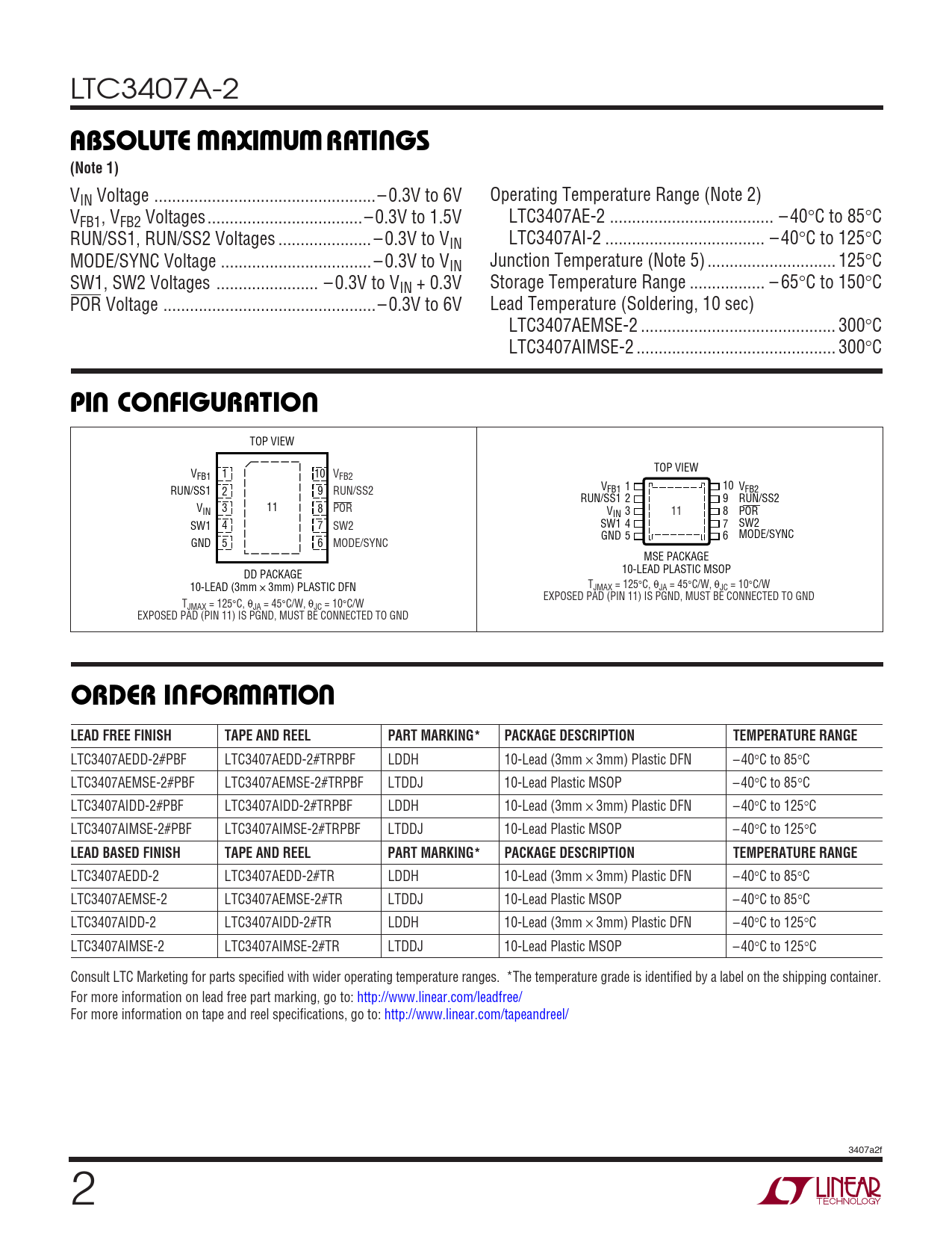 VIN Voltage ..– 0.3V to 6V Operating Temperature Range (Note 2) VFB1, VFB2 Voltages...–0.3V to 1.5V LTC3407AE-2 ... – 40°C to 85°C RUN/SS1, RUN/SS2 Voltages ... – 0.3V to VIN LTC3407AI-2 .. – 40°C to 125°C MODE/SYNC Voltage .. – 0.3V to VIN Junction Temperature (Note 5) ... 125°C SW1, SW2 Voltages ... – 0.3V to VIN + 0.3V Storage Temperature Range ... – 65°C to 150°C POR Voltage ..– 0.3V to 6V Lead Temperature (Soldering, 10 sec) LTC3407AEMSE-2 .. 300°C LTC3407AIMSE-2 ... 300°C
