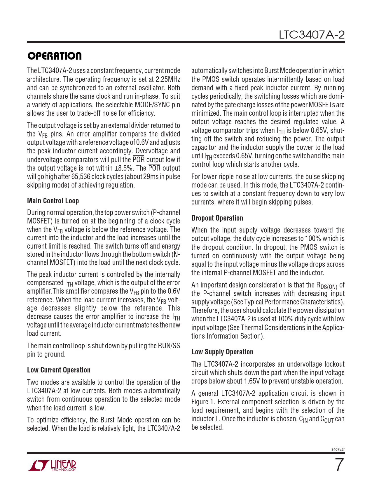 The LTC3407A-2 uses a constant frequency, current mode automatically switches into Burst Mode operation in which architecture. The operating frequency is set at 2.25MHz the PMOS switch operates intermittently based on load and can be synchronized to an external oscillator. Both demand with a fixed peak inductor current. By running channels share the same clock and run in-phase. To suit cycles periodically, the switching losses which are domi- a variety of applications, the selectable MODE/SYNC pin nated by the gate charge losses of the power MOSFETs are allows the user to trade-off noise for efficiency. minimized. The main control loop is interrupted when the output voltage reaches the desired regulated value. A The output voltage is set by an external divider returned to voltage comparator trips when I the V TH is below 0.65V, shut- FB pins. An error amplifier compares the divided ting off the switch and reducing the power. The output output voltage with a reference voltage of 0.6V and adjusts capacitor and the inductor supply the power to the load the peak inductor current accordingly. Overvoltage and until I undervoltage comparators will pull the POR output low if TH exceeds 0.65V, turning on the switch and the main control loop which starts another cycle. the output voltage is not within ±8.5%. The POR output will go high after 65,536 clock cycles (about 29ms in pulse For lower ripple noise at low currents, the pulse skipping skipping mode) of achieving regulation. mode can be used. In this mode, the LTC3407A-2 contin- ues to switch at a constant frequency down to very low