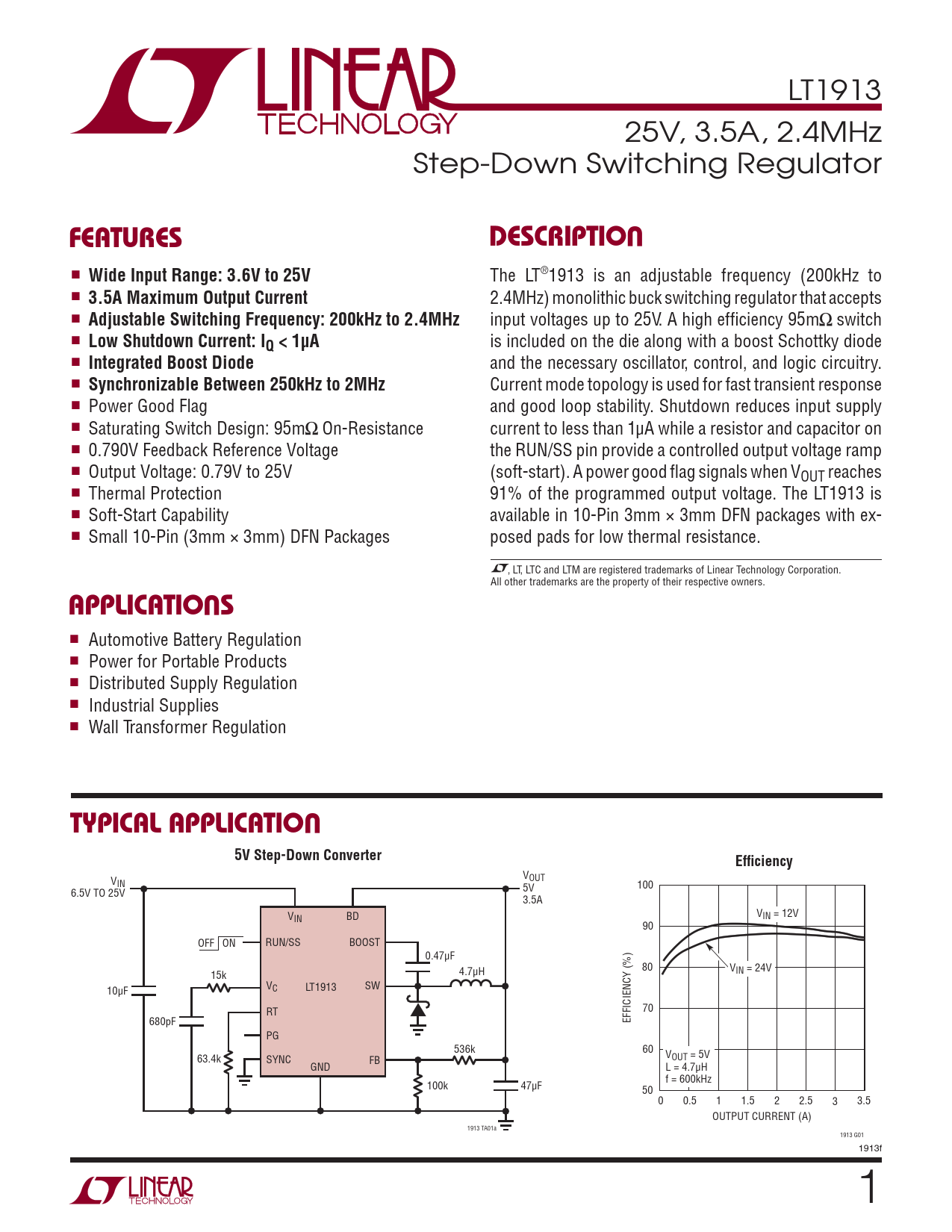 LT1913 25V, 3.5A, 2.4MHz Step-Down Switching Regulator UFEATURESDESCRIPTIO ■ Wide Input Range: 3.6V to 25V The LT®1913 is an adjustable frequency (200kHz to ■ 3.5A Maximum Output Current 2.4MHz) monolithic buck switching regulator that accepts ■ Adjustable Switching Frequency: 200kHz to 2.4MHz input voltages up to 25V. A high effi ciency 95m switch ■ Low Shutdown Current: IQ < 1μA is included on the die along with a boost Schottky diode ■ Integrated Boost Diode and the necessary oscillator, control, and logic circuitry. ■ Synchronizable Between 250kHz to 2MHz Current mode topology is used for fast transient response ■ Power Good Flag and good loop stability. Shutdown reduces input supply ■ Saturating Switch Design: 95m On-Resistance current to less than 1μA while a resistor and capacitor on ■ 0.790V Feedback Reference Voltage the RUN/SS pin provide a controlled output voltage ramp ■ Output Voltage: 0.79V to 25V (soft-start). A power good fl ag signals when VOUT reaches ■ Thermal Protection 91% of the programmed output voltage. The LT1913 is ■ Soft-Start Capability available in 10-Pin 3mm × 3mm DFN packages with ex- ■ Small 10-Pin (3mm × 3mm) DFN Packages posed pads for low thermal resistance. , LT, LTC and LTM are registered trademarks of Linear Technology Corporation. U All other trademarks are the property of their respective owners. APPLICATIO S ■ Automotive Battery Regulation ■ Power for Portable Products ■ Distributed Supply Regulation ■ Industrial Supplies ■ Wall Transformer Regulation UTYPICAL APPLICATIO5V Step-Down ConverterEffi ciency V V OUT IN 5V 100 6.5V TO 25V 3.5A V V IN BD IN = 12V 90 OFF ON RUN/SS BOOST 0.47μF 80 V 15k 4.7μH IN = 24V V LT1913 SW C 10μF RT 70 680pF EFFICIENCY (%) PG 536k 60 63.4k V SYNC FB OUT = 5V GND L = 4.7μH f = 600kHz 100k 47μF 50 0 0.5 1 1.5 2 2.5 3 3.5 OUTPUT CURRENT (A) 1913 TA01a 1913 G01 1913f 1