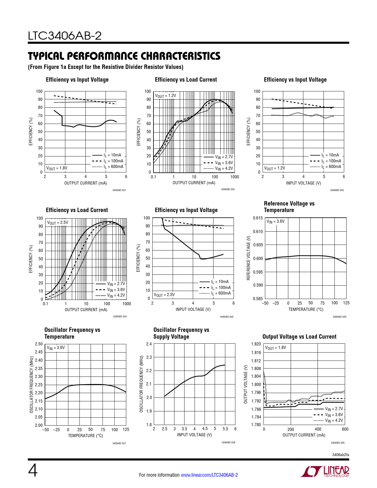 100 100 0.615 VOUT = 2.5V VIN = 3.6V 90 90 0.610 80 80 70 70 0.605 60 60 50 50 0.600 40 40 EFFICIENCY (%) EFFICIENCY (%) 30 30 0.595 REFERENCE VOLTAGE (V) 20 V 20 I IN = 2.7V L = 10mA I 0.590 10 VIN = 3.6V 10 L = 100mA V I IN = 4.2V L = 600mA VOUT = 2.5V 0 0 0.585 0.1 1 10 100 1000 2 3 4 5 6 –50 –25 0 25 50 75 100 125 OUTPUT CURRENT (mA) INPUT VOLTAGE (V) TEMPERATURE (°C) 3406AB2 G04 3406AB2 G05 3406AB2 G06