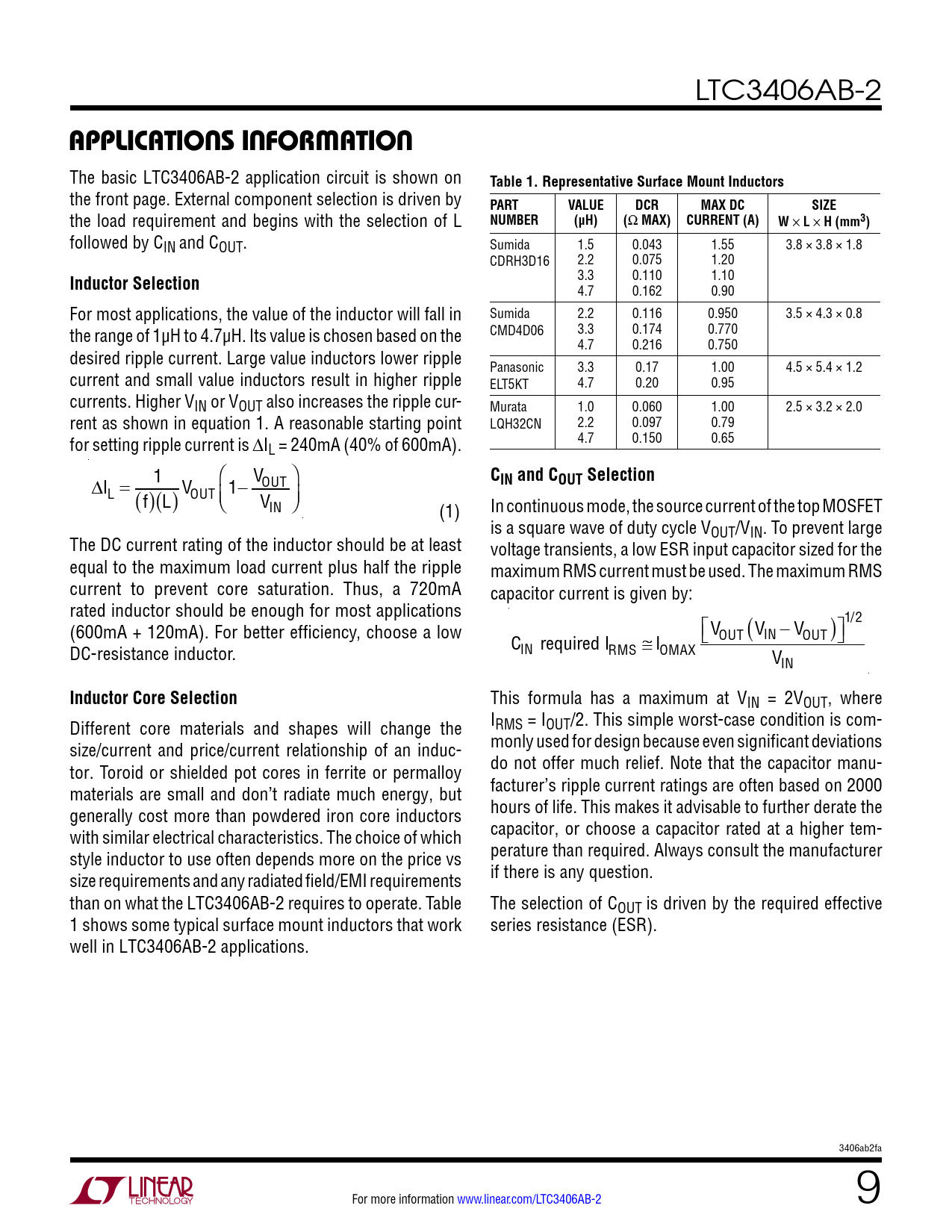 LTC3406AB-2 applicaTions inForMaTion The basic LTC3406AB-2 application circuit is shown on Table 1. Representative Surface Mount Inductors the front page. External component selection is driven by PARTVALUEDCRMAX DCSIZE the load requirement and begins with the selection of L NUMBER(µH)( W MAX) CURRENT (A)W × L × H (mm3) followed by CIN and COUT. Sumida 1.5 0.043 1.55 3.8 × 3.8 × 1.8 CDRH3D16 2.2 0.075 1.20 Inductor Selection 3.3 0.110 1.10 4.7 0.162 0.90 For most applications, the value of the inductor will fall in Sumida 2.2 0.116 0.950 3.5 × 4.3 × 0.8 the range of 1µH to 4.7µH. Its value is chosen based on the CMD4D06 3.3 0.174 0.770 4.7 0.216 0.750 desired ripple current. Large value inductors lower ripple Panasonic 3.3 0.17 1.00 4.5 × 5.4 × 1.2 current and small value inductors result in higher ripple ELT5KT 4.7 0.20 0.95 currents. Higher VIN or VOUT also increases the ripple cur- Murata 1.0 0.060 1.00 2.5 × 3.2 × 2.0 rent as shown in equation 1. A reasonable starting point LQH32CN 2.2 0.097 0.79 for setting ripple current is DI 4.7 0.150 0.65 L = 240mA (40% of 600mA). V C DI OUT IN and COUT Selection L = 1 (f) L() VOUT 1− VIN (1) In continuous mode, the source current of the top MOSFET is a square wave of duty cycle VOUT/VIN. To prevent large The DC current rating of the inductor should be at least voltage transients, a low ESR input capacitor sized for the equal to the maximum load current plus half the ripple maximum RMS current must be used. The maximum RMS current to prevent core saturation. Thus, a 720mA capacitor current is given by: rated inductor should be enough for most applications 1/2 (600mA + 120mA). For better efficiency, choose a low V OUT (VIN − VOUT ) DC-resistance inductor. CIN required IRMS ≅ IOMAX VIN Inductor Core Selection This formula has a maximum at VIN = 2VOUT, where Different core materials and shapes will change the IRMS = IOUT/2. This simple worst-case condition is com- size/current and price/current relationship of an induc- monly used for design because even significant deviations tor. Toroid or shielded pot cores in ferrite or permalloy do not offer much relief. Note that the capacitor manu- materials are small and don’t radiate much energy, but facturer’s ripple current ratings are often based on 2000 generally cost more than powdered iron core inductors hours of life. This makes it advisable to further derate the with similar electrical characteristics. The choice of which capacitor, or choose a capacitor rated at a higher tem- style inductor to use often depends more on the price vs perature than required. Always consult the manufacturer size requirements and any radiated field/EMI requirements if there is any question. than on what the LTC3406AB-2 requires to operate. Table The selection of COUT is driven by the required effective 1 shows some typical surface mount inductors that work series resistance (ESR). well in LTC3406AB-2 applications. 3406ab2fa For more information www.linear.com/LTC3406AB-2 9