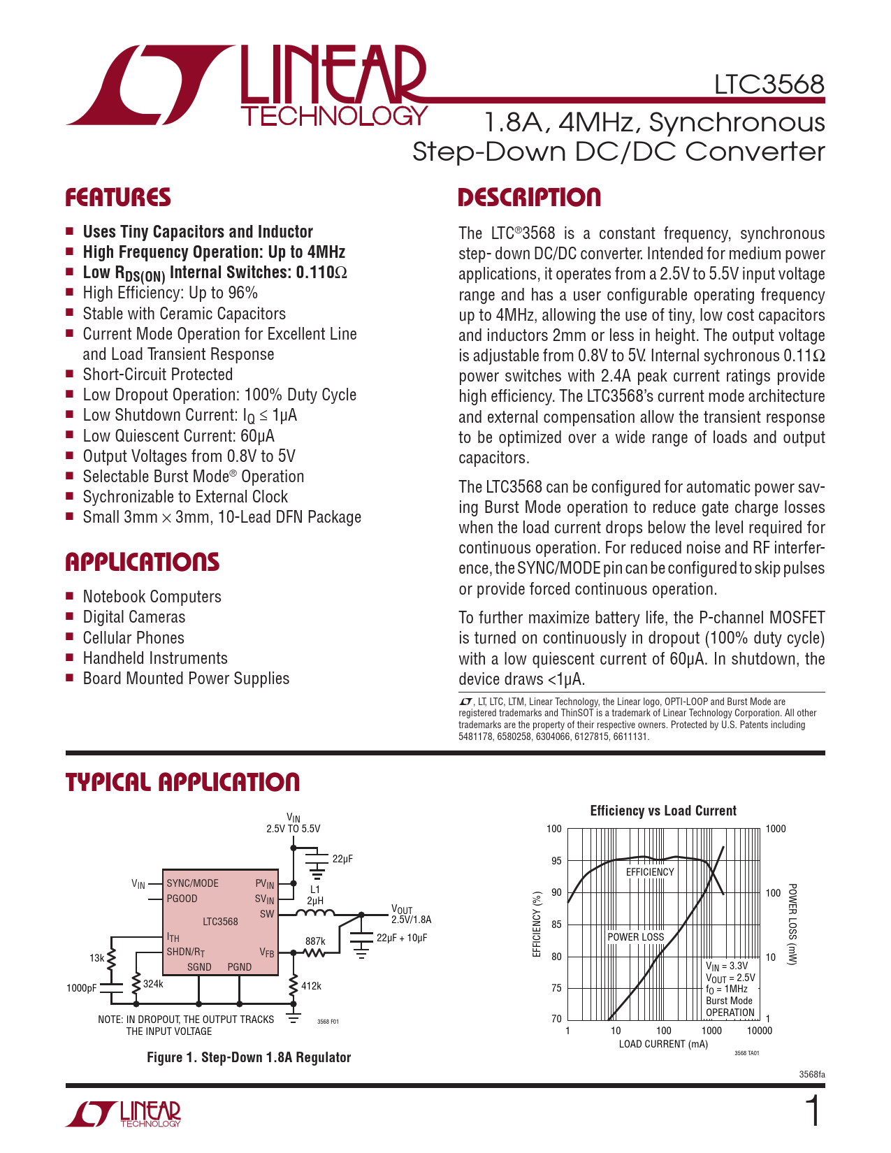 LTC3568 1.8A, 4MHz, Synchronous Step-Down DC/DC Converter FeaTures DescripTion n Uses Tiny Capacitors and Inductor The LTC®3568 is a constant frequency, synchronous n High Frequency Operation: Up to 4MHz step- down DC/DC converter. Intended for medium power n Low RDS(ON) Internal Switches: 0.110 Ω applications, it operates from a 2.5V to 5.5V input voltage n High Efficiency: Up to 96% range and has a user configurable operating frequency n Stable with Ceramic Capacitors up to 4MHz, allowing the use of tiny, low cost capacitors n Current Mode Operation for Excellent Line and inductors 2mm or less in height. The output voltage and Load Transient Response is adjustable from 0.8V to 5V. Internal sychronous 0.11Ω n Short-Circuit Protected power switches with 2.4A peak current ratings provide n Low Dropout Operation: 100% Duty Cycle high efficiency. The LTC3568’s current mode architecture n Low Shutdown Current: IQ ≤ 1µA and external compensation allow the transient response n Low Quiescent Current: 60µA to be optimized over a wide range of loads and output n Output Voltages from 0.8V to 5V capacitors. n Selectable Burst Mode® Operation The LTC3568 can be configured for automatic power sav- n Sychronizable to External Clock ing Burst Mode operation to reduce gate charge losses n Small 3mm × 3mm, 10-Lead DFN Package when the load current drops below the level required for applicaTions continuous operation. For reduced noise and RF interfer- ence, the SYNC/MODE pin can be configured to skip pulses n or provide forced continuous operation. Notebook Computers n Digital Cameras To further maximize battery life, the P-channel MOSFET n Cellular Phones is turned on continuously in dropout (100% duty cycle) n Handheld Instruments with a low quiescent current of 60µA. In shutdown, the n Board Mounted Power Supplies device draws <1µA. L, LT, LTC, LTM, Linear Technology, the Linear logo, OPTI-LOOP and Burst Mode are registered trademarks and ThinSOT is a trademark of Linear Technology Corporation. All other trademarks are the property of their respective owners. Protected by U.S. Patents including 5481178, 6580258, 6304066, 6127815, 6611131. Typical applicaTion Efficiency vs Load Current VIN 2.5V TO 5.5V 100 1000 22µF 95 EFFICIENCY V POWER LOSS (mW) IN SYNC/MODE PVIN L1 PGOOD SV 90 100 IN 2µH SW VOUT LTC3568 2.5V/1.8A 85 ITH 887k 22µF + 10µF POWER LOSS SHDN/RT VFB 13k EFFICIENCY (%) 80 10 SGND PGND VIN = 3.3V VOUT = 2.5V 1000pF 324k 412k 75 fO = 1MHz Burst Mode OPERATION NOTE: IN DROPOUT, THE OUTPUT TRACKS 3568 F01 70 1 THE INPUT VOLTAGE 1 10 100 1000 10000 LOAD CURRENT (mA) Figure 1. Step-Down 1.8A Regulator 3568 TA01 3568fa Document Outline Features Applications Description Typical Application Absolute Maximum Ratings Pin Configuration Order Information Electrical Characteristics Typical Performance Characteristics Pin Functions Block Diagram Operation Applications Information Typical Applications Package Description Revision History Typical Application Related Parts