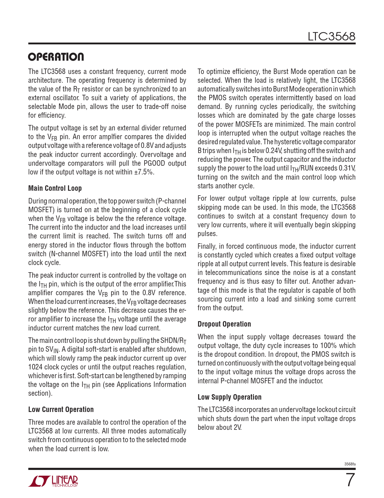 starts another cycle. During normal operation, the top power switch (P-channel For lower output voltage ripple at low currents, pulse MOSFET) is turned on at the beginning of a clock cycle skipping mode can be used. In this mode, the LTC3568 when the V continues to switch at a constant frequency down to FB voltage is below the the reference voltage. The current into the inductor and the load increases until very low currents, where it will eventually begin skipping the current limit is reached. The switch turns off and pulses. energy stored in the inductor flows through the bottom Finally, in forced continuous mode, the inductor current switch (N-channel MOSFET) into the load until the next is constantly cycled which creates a fixed output voltage clock cycle. ripple at all output current levels. This feature is desirable The peak inductor current is controlled by the voltage on in telecommunications since the noise is at a constant the I frequency and is thus easy to filter out. Another advan- TH pin, which is the output of the error amplifier.This amplifier compares the V tage of this mode is that the regulator is capable of both FB pin to the 0.8V reference. When the load current increases, the V sourcing current into a load and sinking some current FB voltage decreases slightly below the reference. This decrease causes the er- from the output. ror amplifier to increase the ITH voltage until the average inductor current matches the new load current.