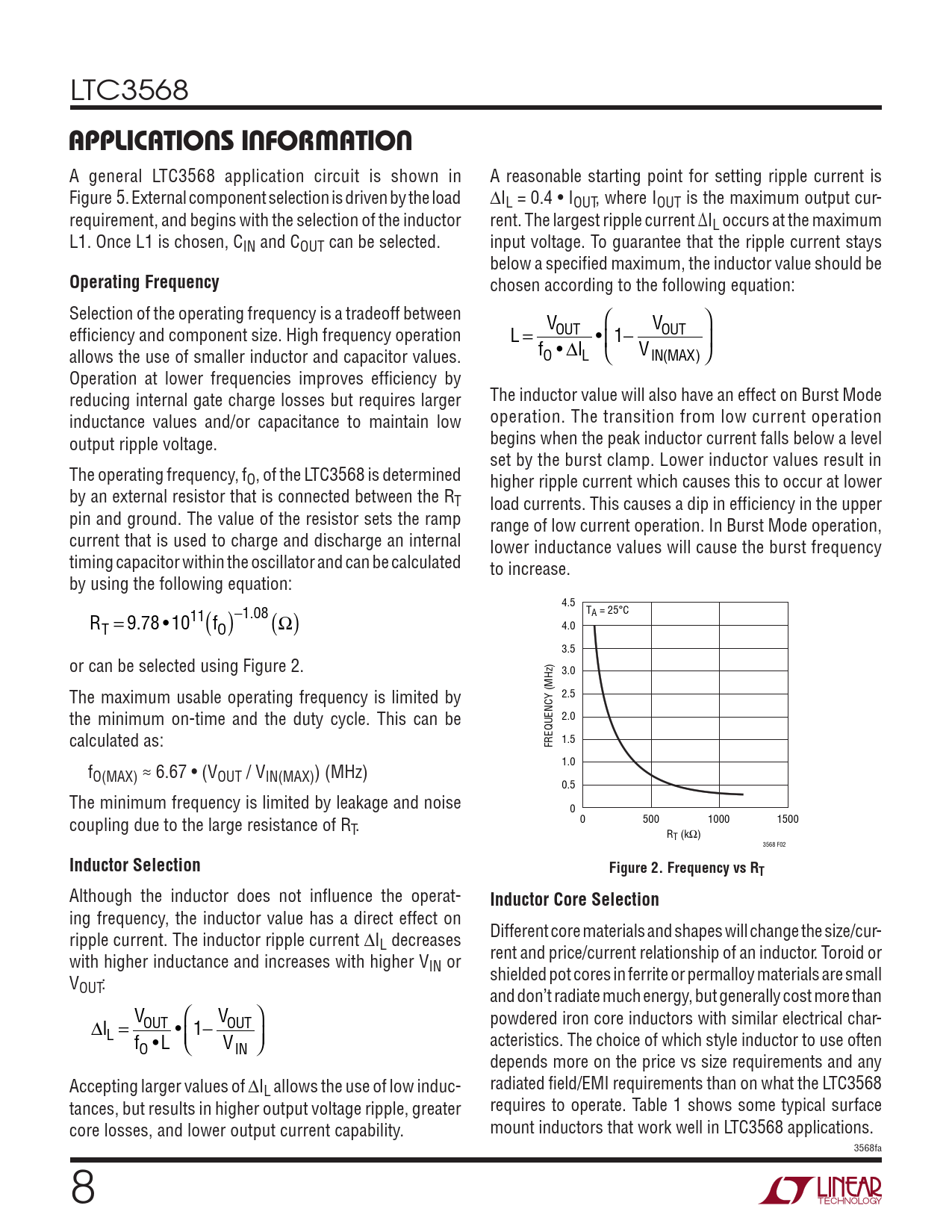 chosen according to the following equation: Selection of the operating frequency is a tradeoff between V  V  efficiency and component size. High frequency operation L OUT OUT = •  − 1  allows the use of smaller inductor and capacitor values. f • I Δ V O L  IN M ( AX)  Operation at lower frequencies improves efficiency by reducing internal gate charge losses but requires larger The inductor value will also have an effect on Burst Mode inductance values and/or capacitance to maintain low operation. The transition from low current operation output ripple voltage. begins when the peak inductor current falls below a level set by the burst clamp. Lower inductor values result in The operating frequency, fO, of the LTC3568 is determined higher ripple current which causes this to occur at lower by an external resistor that is connected between the RT load currents. This causes a dip in efficiency in the upper pin and ground. The value of the resistor sets the ramp range of low current operation. In Burst Mode operation, current that is used to charge and discharge an internal lower inductance values wil cause the burst frequency timing capacitor within the oscillator and can be calculated to increase. by using the following equation: 4.5 TA = 25°C = − 9 78 1011 1 08 . • . (Ω) 4.0 ( ) R f T O 3.5 or can be selected using Figure 2. 3.0 2.5 The maximum usable operating frequency is limited by 2.0 the minimum on-time and the duty cycle. This can be calculated as: FREQUENCY (MHz) 1.5 1.0 fO(MAX) ≈ 6.67 • (VOUT / VIN(MAX)) (MHz) 0.5 The minimum frequency is limited by leakage and noise 0 0 500 1000 1500 coupling due to the large resistance of RT. RT (kΩ) 3568 F02