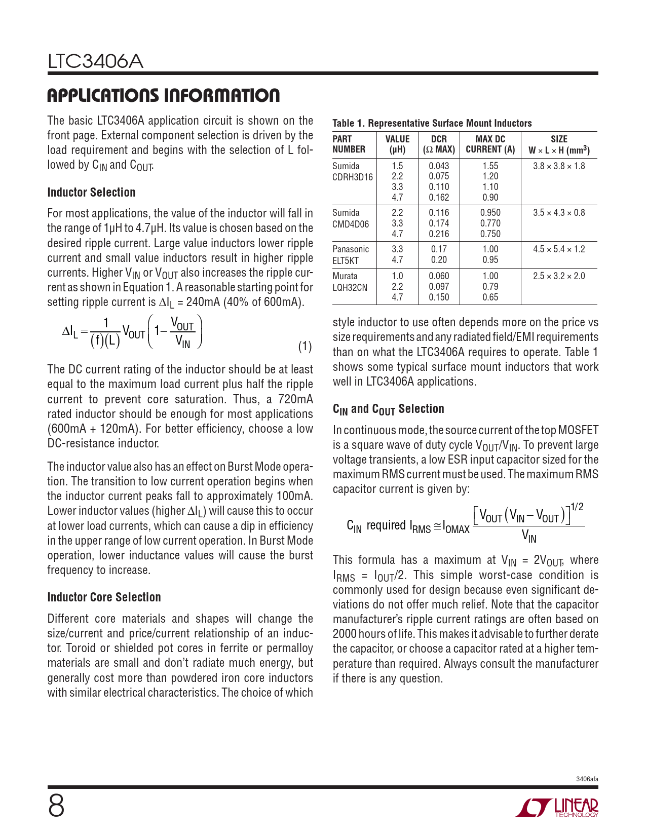 LTC3406A APPLICATIONS INFORMATION The basic LTC3406A application circuit is shown on the Table 1. Representative Surface Mount Inductors front page. External component selection is driven by the PARTVALUEDCRMAX DCSIZE load requirement and begins with the selection of L fol- NUMBER(μH)( Ω MAX)CURRENT (A)W × L × H (mm3) lowed by CIN and COUT. Sumida 1.5 0.043 1.55 3.8 × 3.8 × 1.8 CDRH3D16 2.2 0.075 1.20 Inductor Selection 3.3 0.110 1.10 4.7 0.162 0.90 For most applications, the value of the inductor will fall in Sumida 2.2 0.116 0.950 3.5 × 4.3 × 0.8 the range of 1μH to 4.7μH. Its value is chosen based on the CMD4D06 3.3 0.174 0.770 4.7 0.216 0.750 desired ripple current. Large value inductors lower ripple Panasonic 3.3 0.17 1.00 4.5 × 5.4 × 1.2 current and small value inductors result in higher ripple ELT5KT 4.7 0.20 0.95 currents. Higher VIN or VOUT also increases the ripple cur- Murata 1.0 0.060 1.00 2.5 × 3.2 × 2.0 rent as shown in Equation 1. A reasonable starting point for LQH32CN 2.2 0.097 0.79 setting ripple current is ∆I 4.7 0.150 0.65 L = 240mA (40% of 600mA). style inductor to use often depends more on the price vs I = 1 L (f) L() VOUT 1 VOUT V size requirements and any radiated fi eld/EMI requirements IN (1) than on what the LTC3406A requires to operate. Table 1 The DC current rating of the inductor should be at least shows some typical surface mount inductors that work equal to the maximum load current plus half the ripple well in LTC3406A applications. current to prevent core saturation. Thus, a 720mA rated inductor should be enough for most applications CIN and COUT Selection (600mA + 120mA). For better effi ciency, choose a low In continuous mode, the source current of the top MOSFET DC-resistance inductor. is a square wave of duty cycle VOUT/VIN. To prevent large voltage transients, a low ESR input capacitor sized for the The inductor value also has an effect on Burst Mode opera- maximum RMS current must be used. The maximum RMS tion. The transition to low current operation begins when capacitor current is given by: the inductor current peaks fall to approximately 100mA. Lower inductor values (higher ∆I 1/2 L) will cause this to occur V ( ) OUT VIN VOUT at lower load currents, which can cause a dip in effi ciency C IN required IRMS IOMAX V in the upper range of low current operation. In Burst Mode IN operation, lower inductance values will cause the burst This formula has a maximum at VIN = 2VOUT, where frequency to increase. IRMS = IOUT/2. This simple worst-case condition is commonly used for design because even signifi cant de- Inductor Core Selection viations do not offer much relief. Note that the capacitor Different core materials and shapes will change the manufacturer’s ripple current ratings are often based on size/current and price/current relationship of an induc- 2000 hours of life. This makes it advisable to further derate tor. Toroid or shielded pot cores in ferrite or permalloy the capacitor, or choose a capacitor rated at a higher tem- materials are small and don’t radiate much energy, but perature than required. Always consult the manufacturer generally cost more than powdered iron core inductors if there is any question. with similar electrical characteristics. The choice of which 3406afa 8