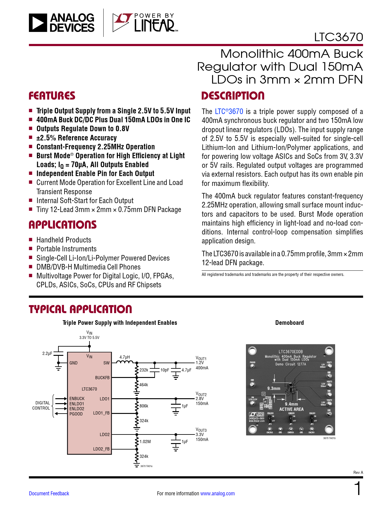 LTC3670 Monolithic 400mA Buck Regulator with Dual 150mA LDOs in 3mm × 2mm DFN FEATURESDESCRIPTION n Triple Output Supply from a Single 2.5V to 5.5V Input The LTC®3670 is a triple power supply composed of a n 400mA Buck DC/DC Plus Dual 150mA LDOs in One IC 400mA synchronous buck regulator and two 150mA low n Outputs Regulate Down to 0.8V dropout linear regulators (LDOs). The input supply range n ±2.5% Reference Accuracy of 2.5V to 5.5V is especially well-suited for single-cell n Constant-Frequency 2.25MHz Operation Lithium-Ion and Lithium-Ion/Polymer applications, and n Burst Mode ® Operation for High Efficiency at Light for powering low voltage ASICs and SoCs from 3V, 3.3V Loads; IQ = 70µA, All Outputs Enabled or 5V rails. Regulated output voltages are programmed n Independent Enable Pin for Each Output via external resistors. Each output has its own enable pin n Current Mode Operation for Excellent Line and Load for maximum flexibility. Transient Response The 400mA buck regulator features constant-frequency n Internal Soft-Start for Each Output 2.25MHz operation, allowing small surface mount induc- n Tiny 12-Lead 3mm × 2mm × 0.75mm DFN Package tors and capacitors to be used. Burst Mode operation APPLICATIONS maintains high efficiency in light-load and no-load con- ditions. Internal control-loop compensation simplifies n Handheld Products application design. n Portable Instruments The LTC3670 is available in a 0.75mm profile, 3mm × 2mm n Single-Cell Li-Ion/Li-Polymer Powered Devices 12-lead DFN package. n DMB/DVB-H Multimedia Cell Phones n Multivoltage Power for Digital Logic, I/O, FPGAs, All registered trademarks and trademarks are the property of their respective owners. CPLDs, ASICs, SoCs, CPUs and RF Chipsets TYPICAL APPLICATIONTriple Power Supply with Independent EnablesDemoboard VIN 3.3V TO 5.5V 2.2µF VIN 4.7µH VOUT1 GND SW 1.2V 232k 400mA 10pF 4.7µF BUCKFB 464k LTC3670 9.3mm VOUT2 ENBUCK LDO1 2.8V DIGITAL ENLDO1 150mA 9.4mm CONTROL 806k 1µF ENLDO2 ACTIVE AREA PGOOD LDO1_FB 324k VOUT3 LDO2 3.3V 3670 TA01b 1.02M 150mA 1µF LDO2_FB 324k 3670 TA01a Rev A Document Feedback For more information www.analog.com 1 Document Outline Features Description Applications Typical Application Absolute Maximum Ratings Pin Configuration Electrical Characteristics Typical Performance Characteristics Pin Functions Block Diagram Operation Typical Application Related Parts